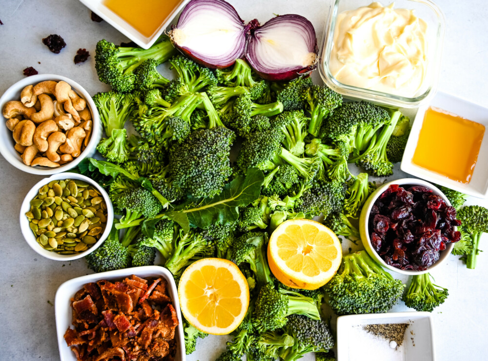 - Combine broccoli, red onion, cranberries, crumbled bacon, cashews, and pumpkin seeds in a large serving bowl.