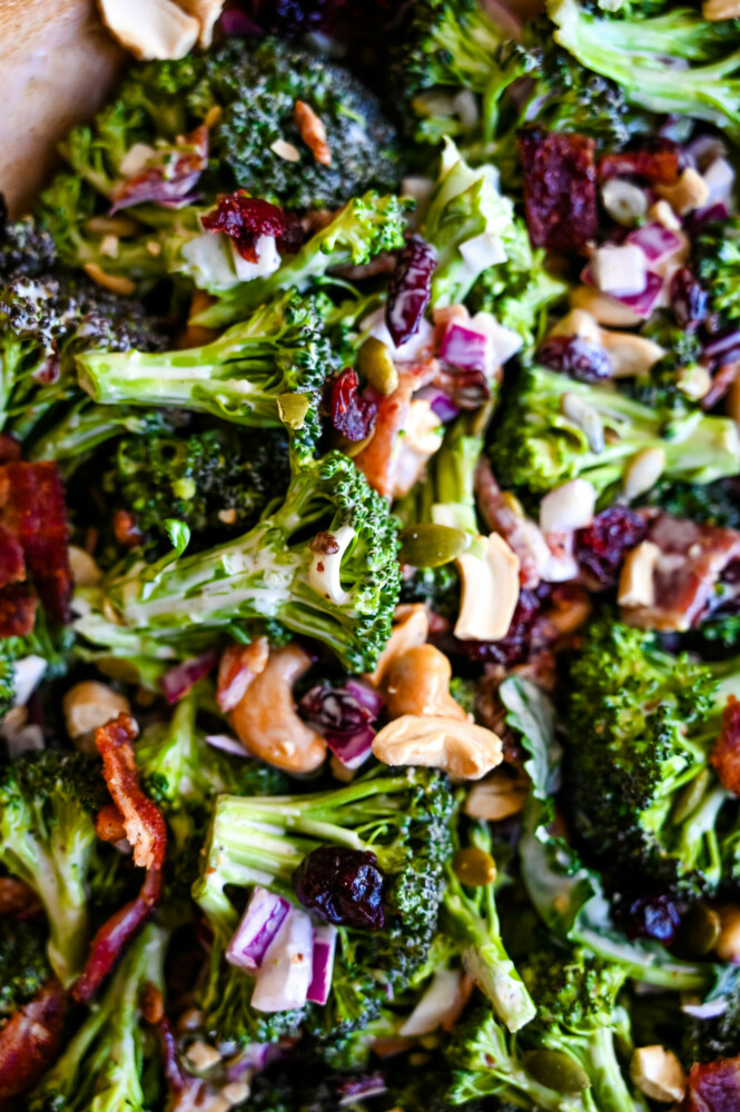 When making broccoli crunch salad, it’s important to use fresh broccoli. The broccoli florets should be bright green and firm. If the broccoli is starting to turn yellow or has a mushy texture, it’s not fresh, and it won’t taste as good. Nor will it last in the fridge for leftovers.