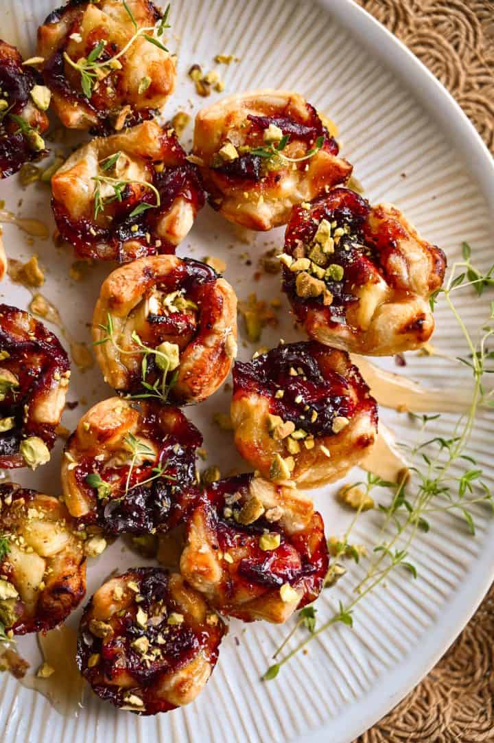 - Top with cranberry sauce, honey, and thyme.