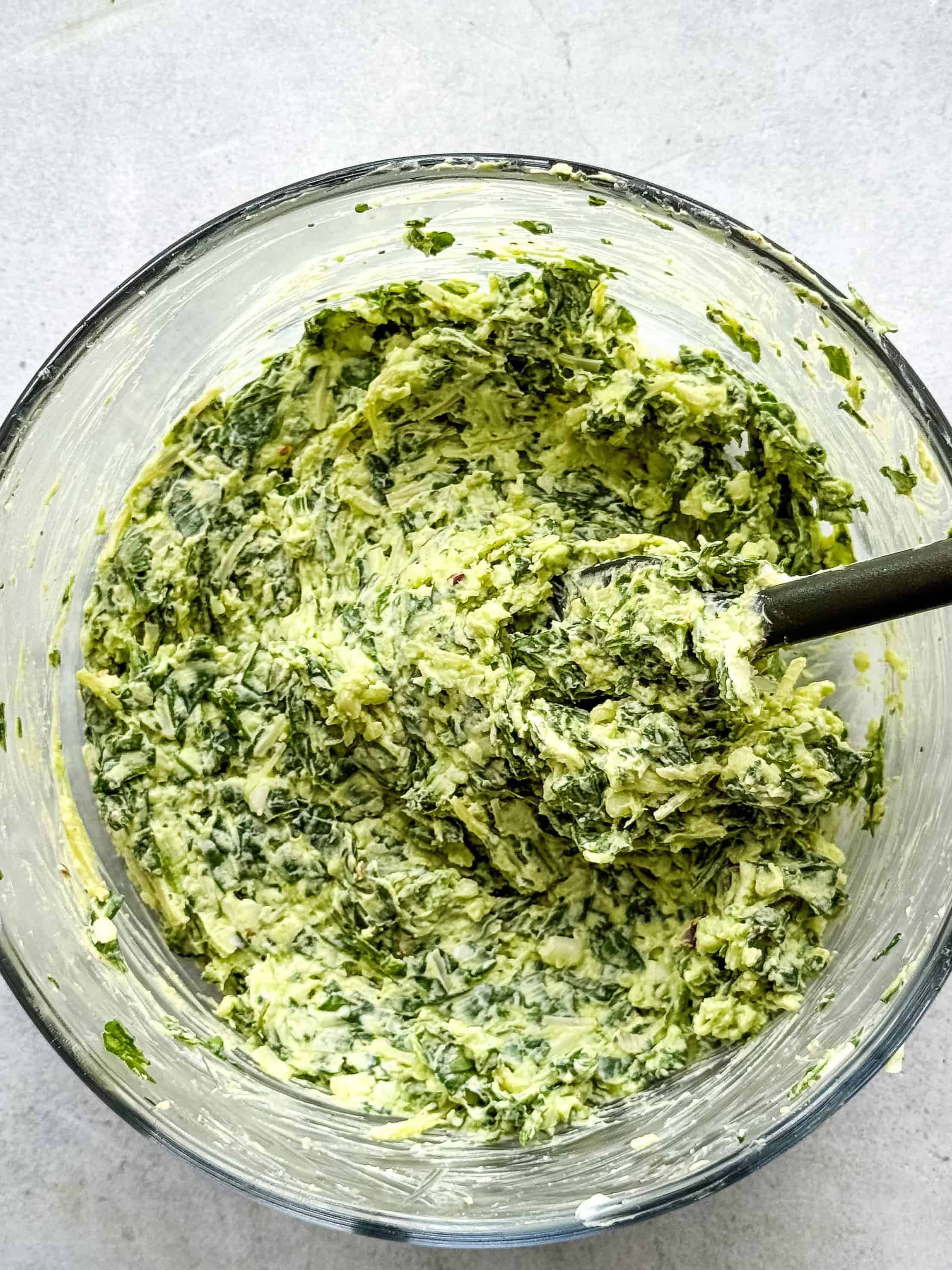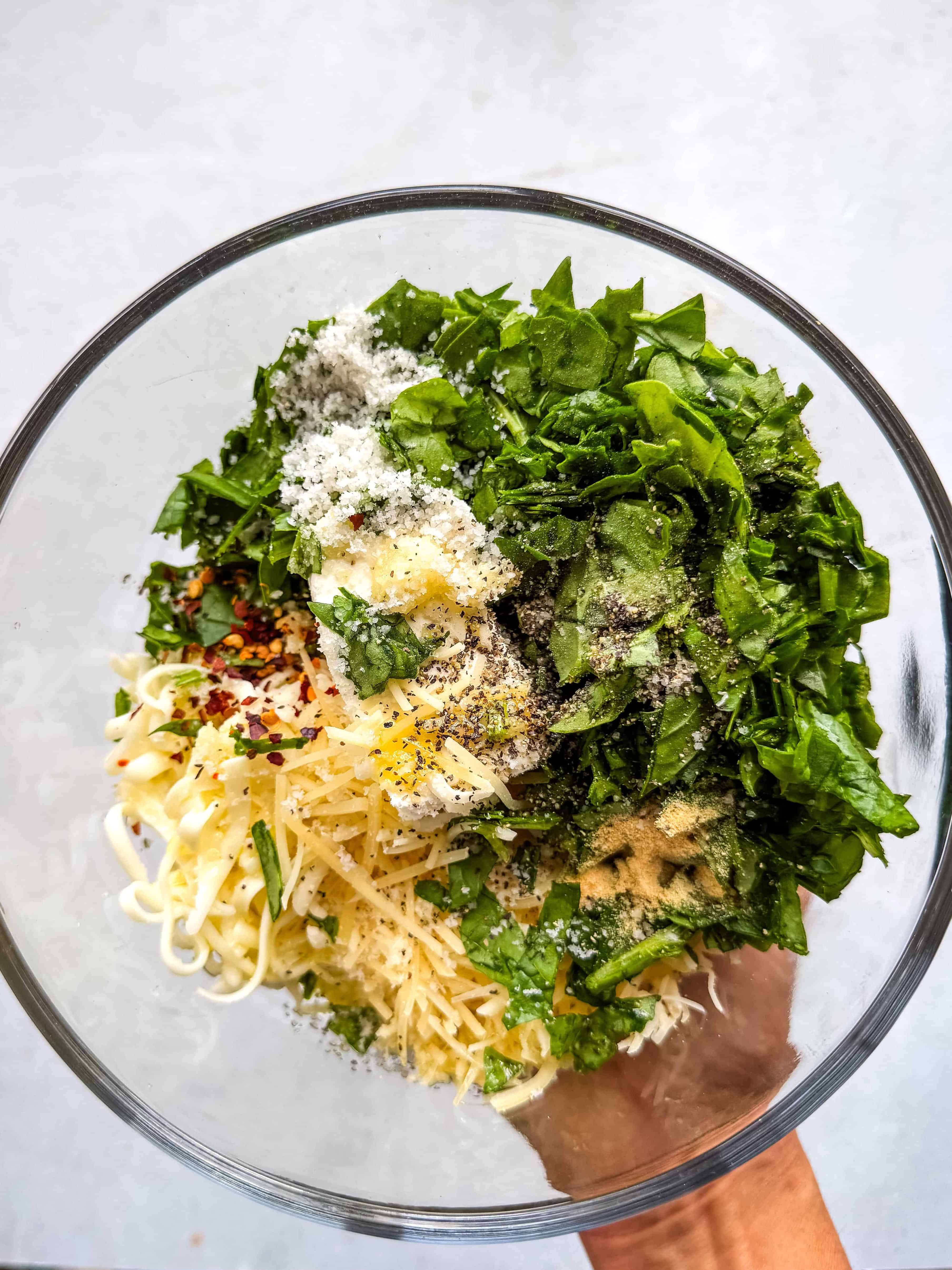 - Mix cream cheese, mozzarella, Parmesan, fresh spinach, garlic powder, salt + pepper.