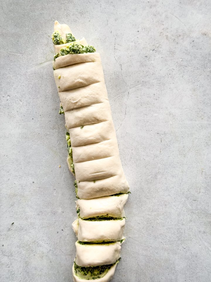 - Slice into ½-inch pinwheels and place on a baking sheet.