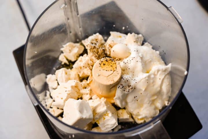 - Add feta, yogurt, olive oil, garlic, and lemon to a food processor. Blend until smooth and fluffy.