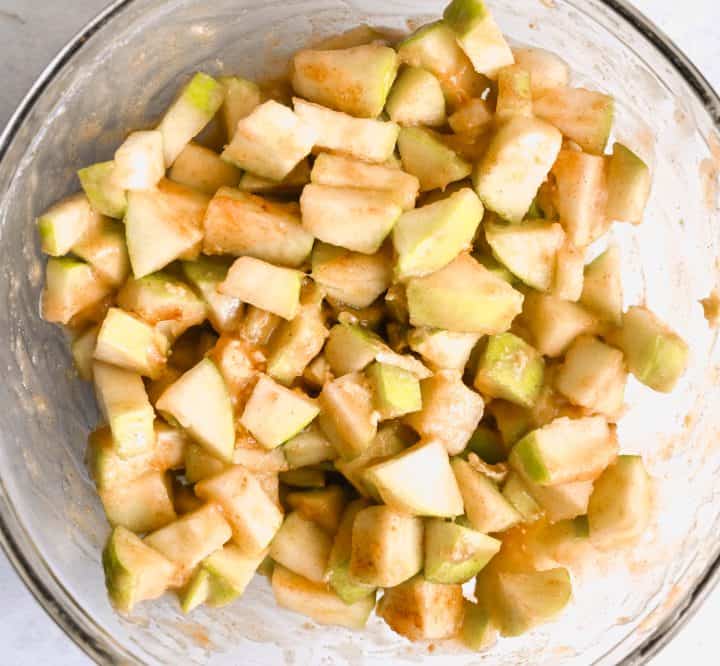 - In a separate bowl, toss diced apples with melted butter, brown sugar, and cinnamon.
