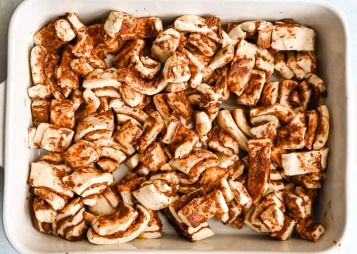 - Spread the quartered cinnamon rolls evenly in the baking dish.