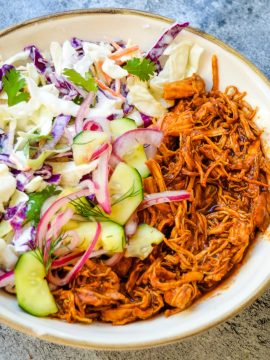 Shredded BBQ Chicken & Coleslaw + Quick Pickles Cucumbers