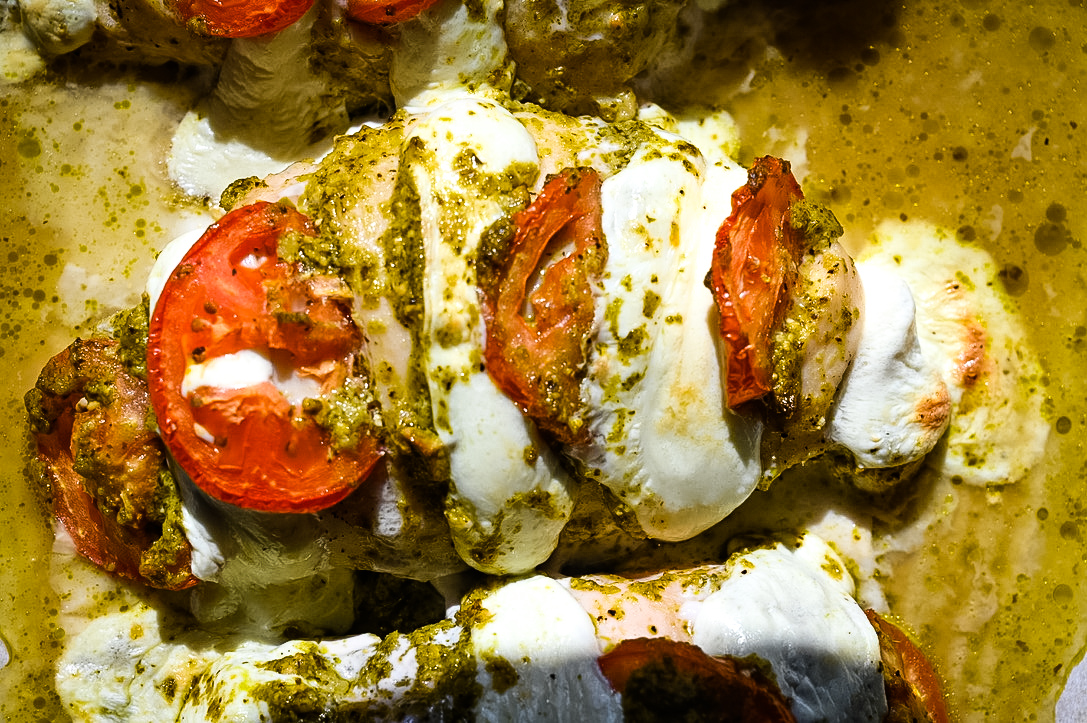 - Fill the slits alternatively with tomato and mozzarella slices. Liberally brush the chicken with pesto. Transfer the chicken to the prepared baking sheet.