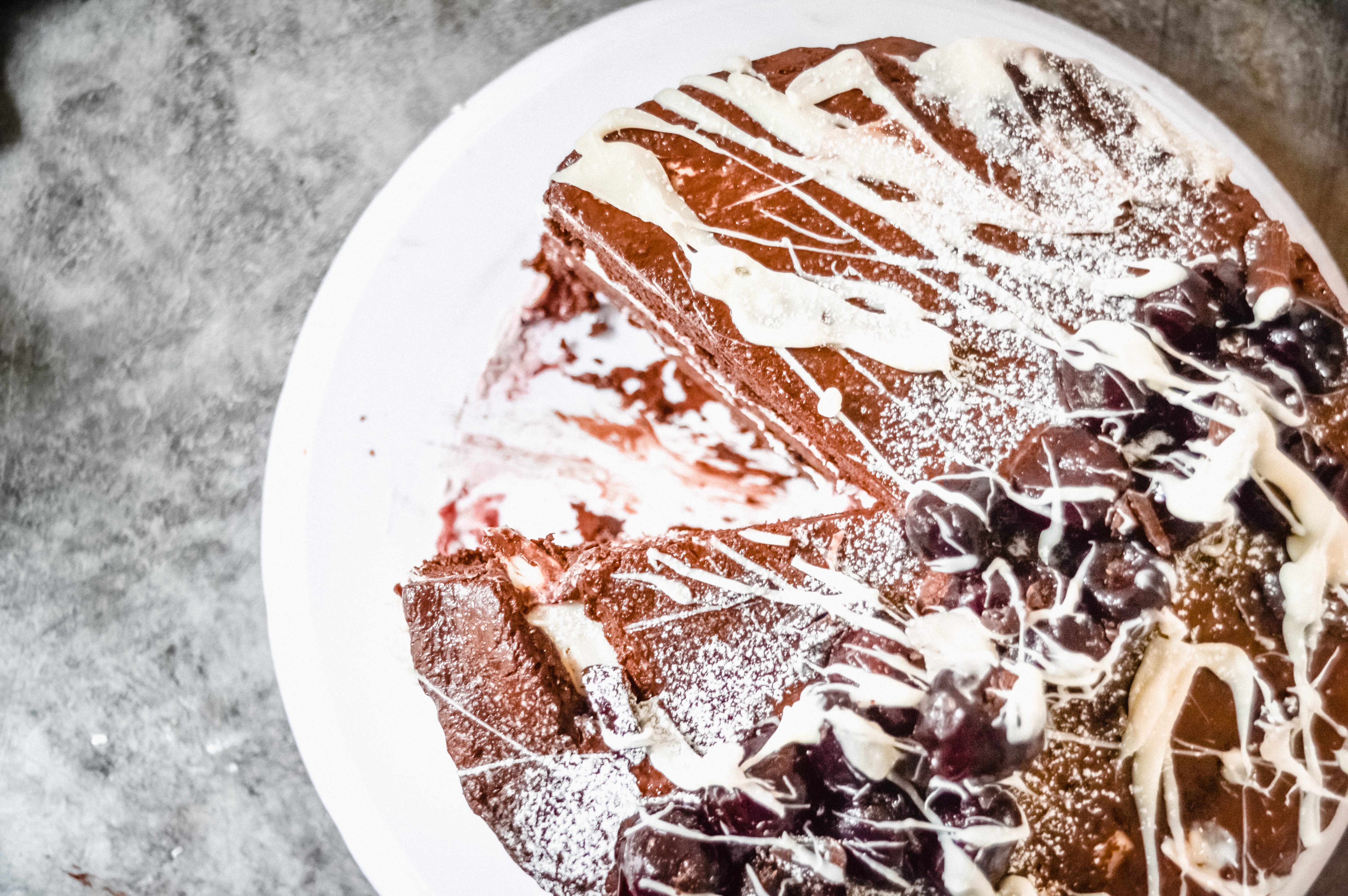 Garnish with more cherries, melted chocolate ganache, and powdered sugar.