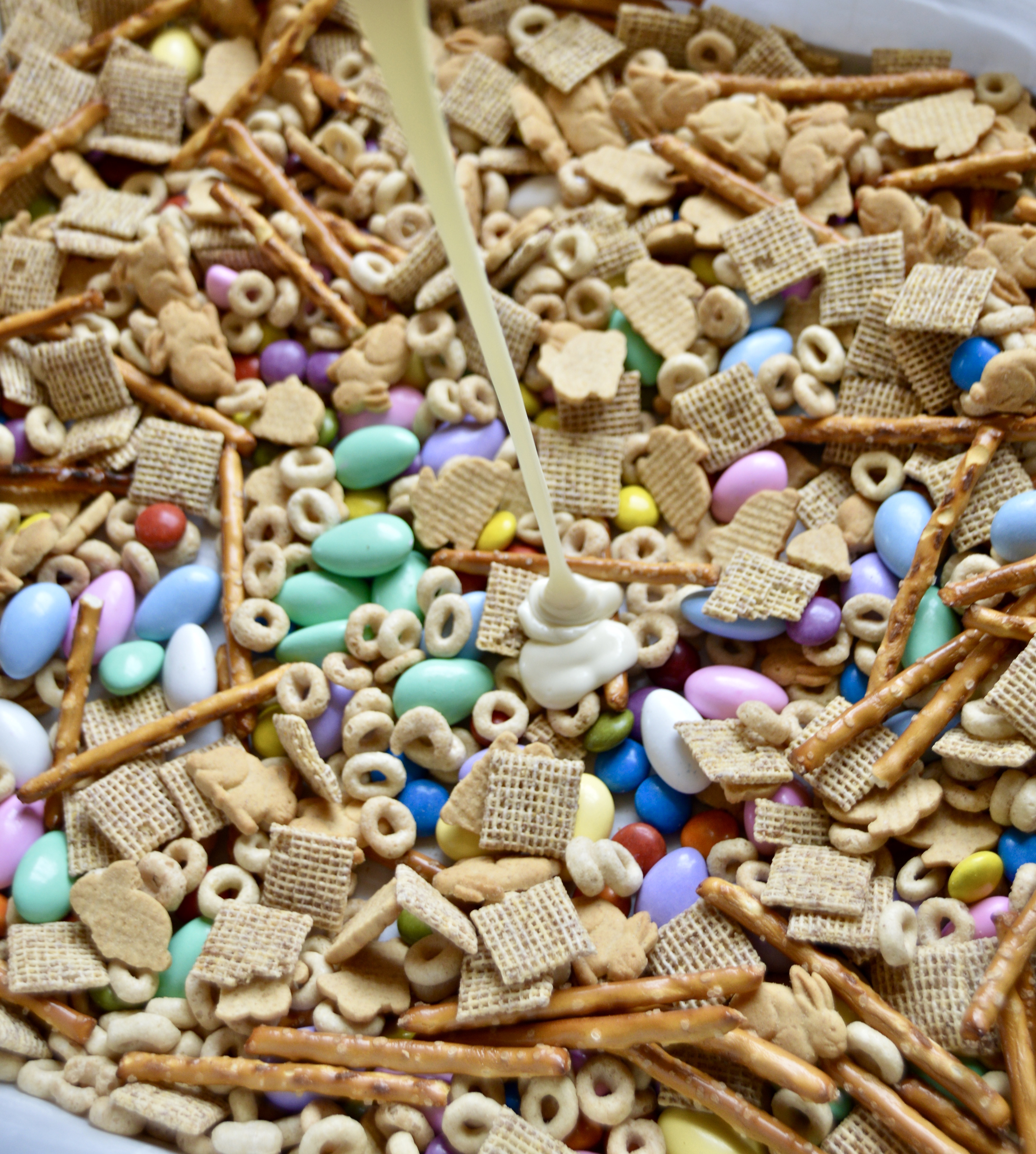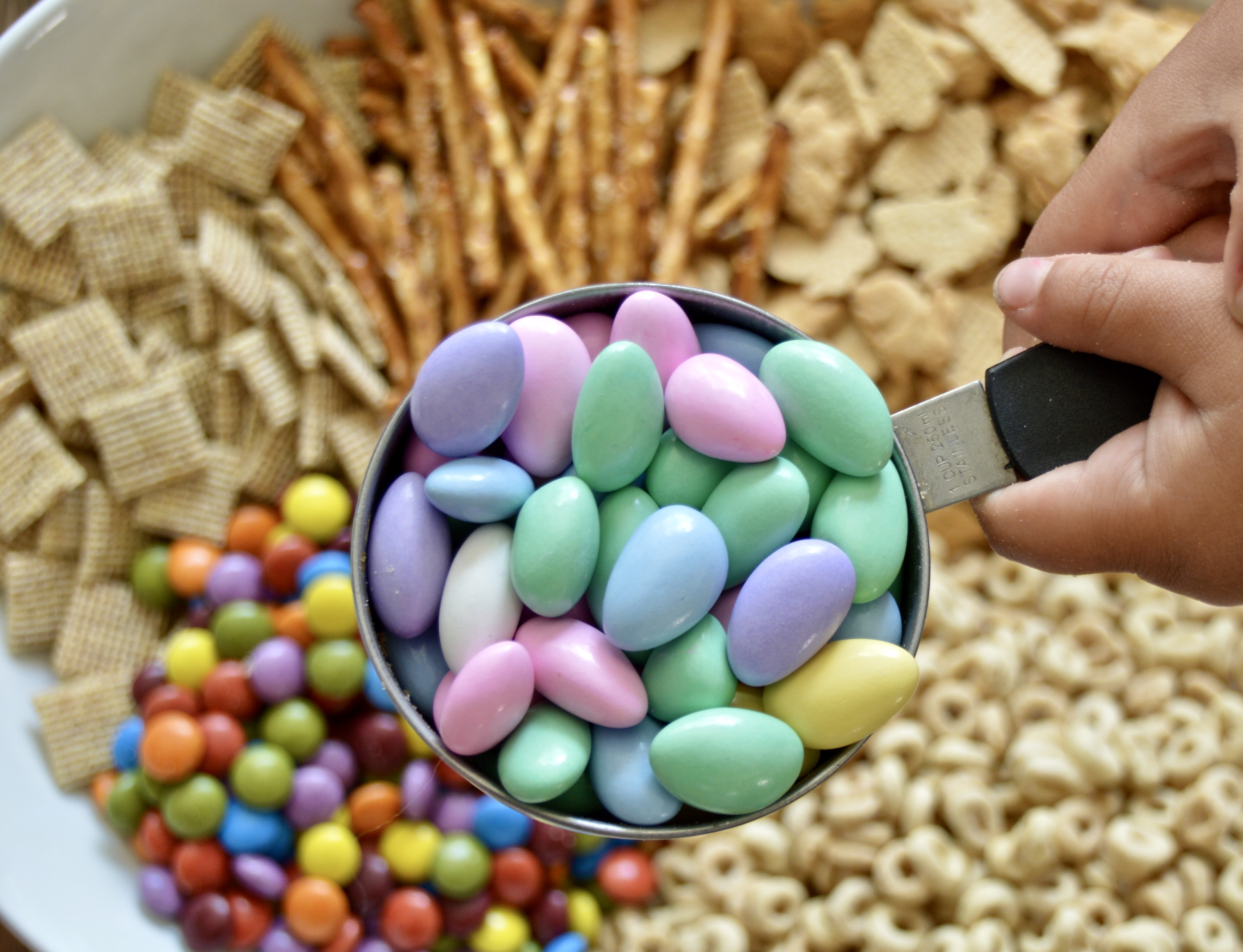 - In a large bowl add in the pretzel sticks, multigrain squares, cheerios, bunny grams, m&m's, and Jordan almonds. Try to evenly distribute everything.