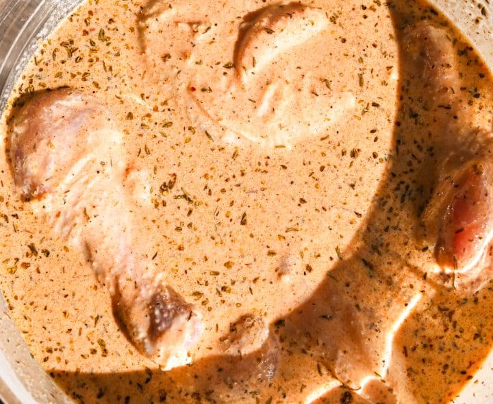 In a large bowl, whisk together the buttermilk, lemon or pickle juice, minced garlic, hot sauce, Dijon mustard, olive oil, brown sugar or honey, smoked paprika, paprika, garlic powder, onion powder, oregano, thyme, salt, pepper, and chicken bouillon if using.