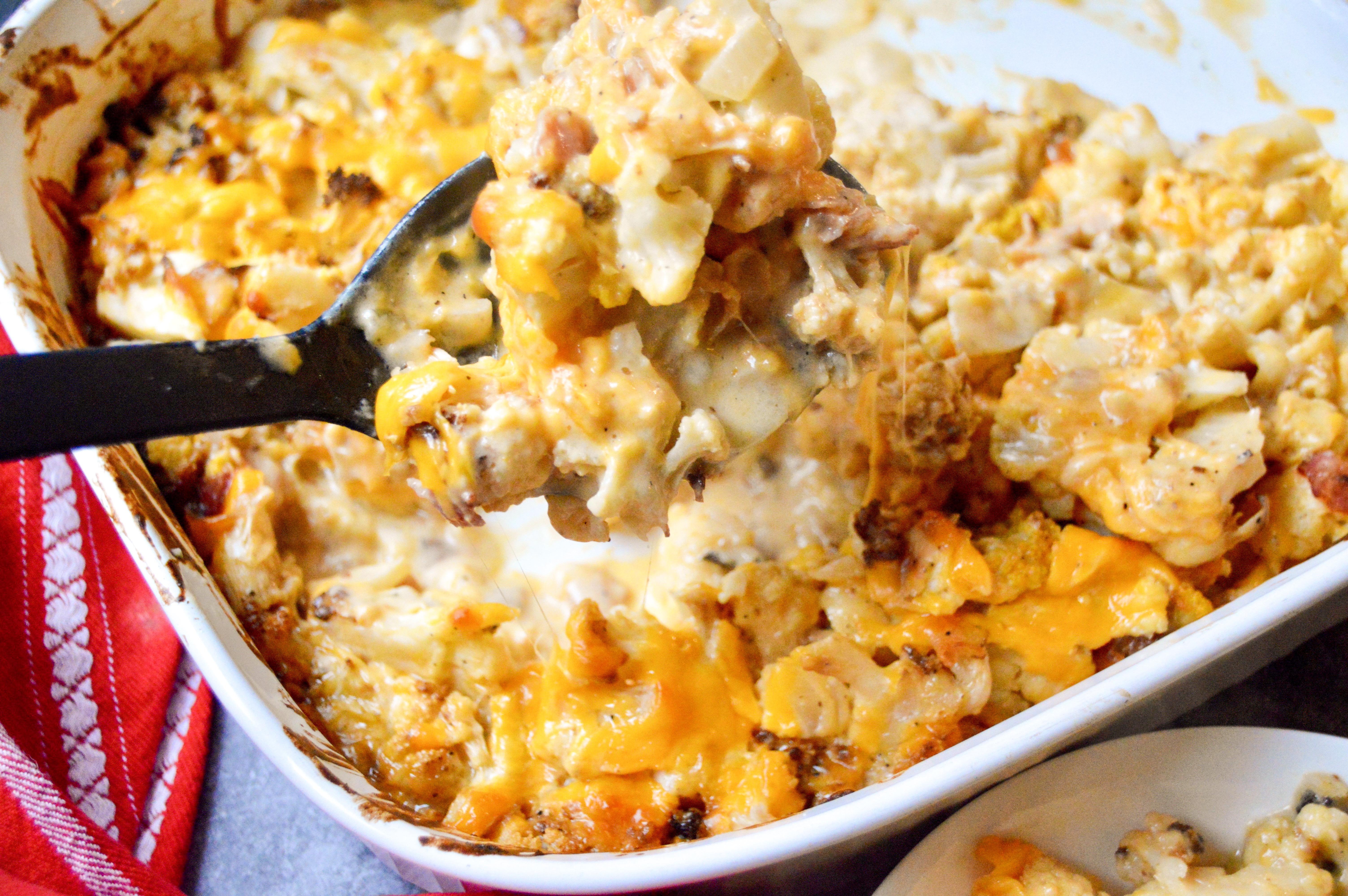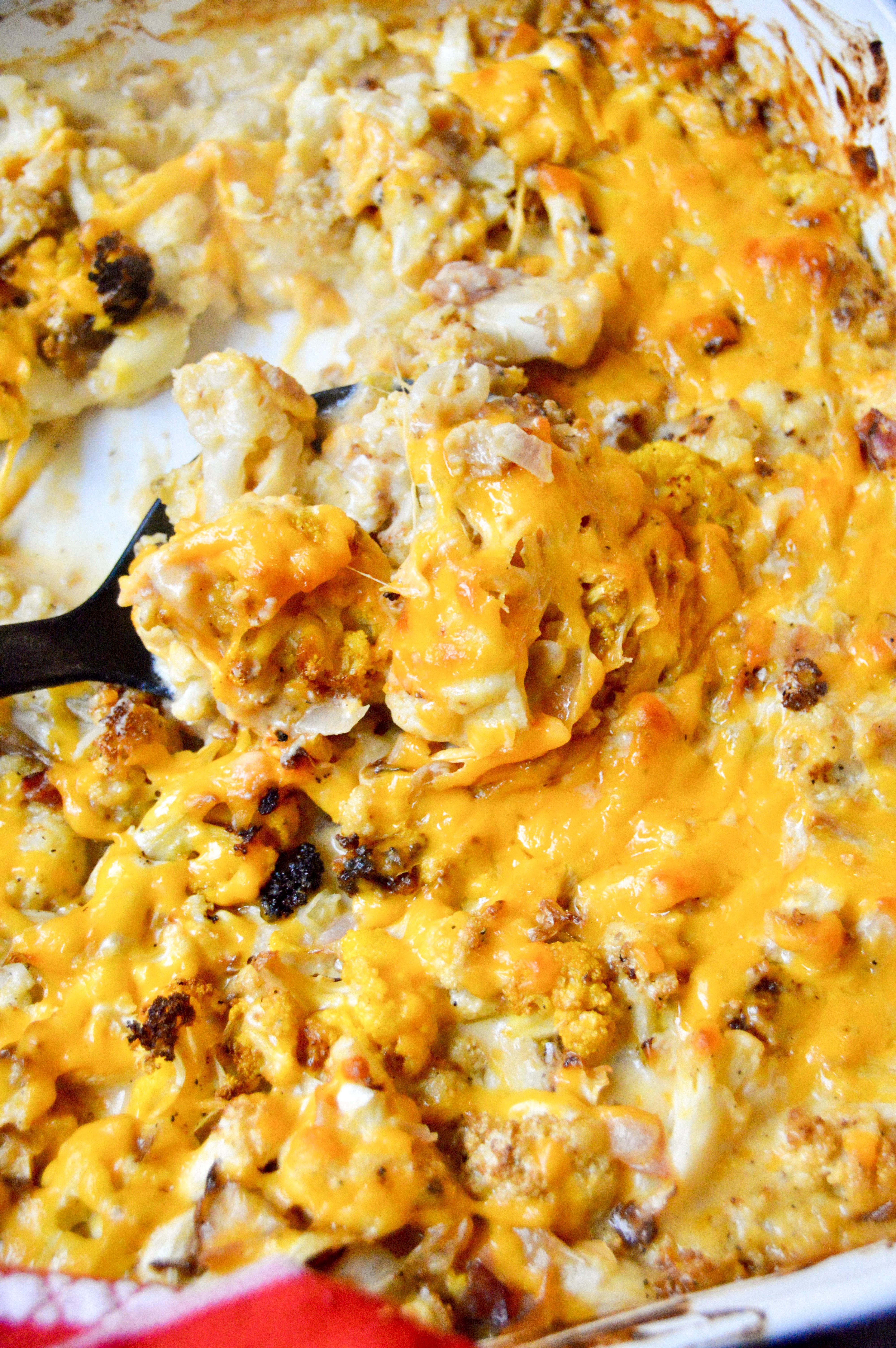 - Stir in your bacon pieces and cauliflower then transfer to a casserole dish and top with the rest of the cheese.