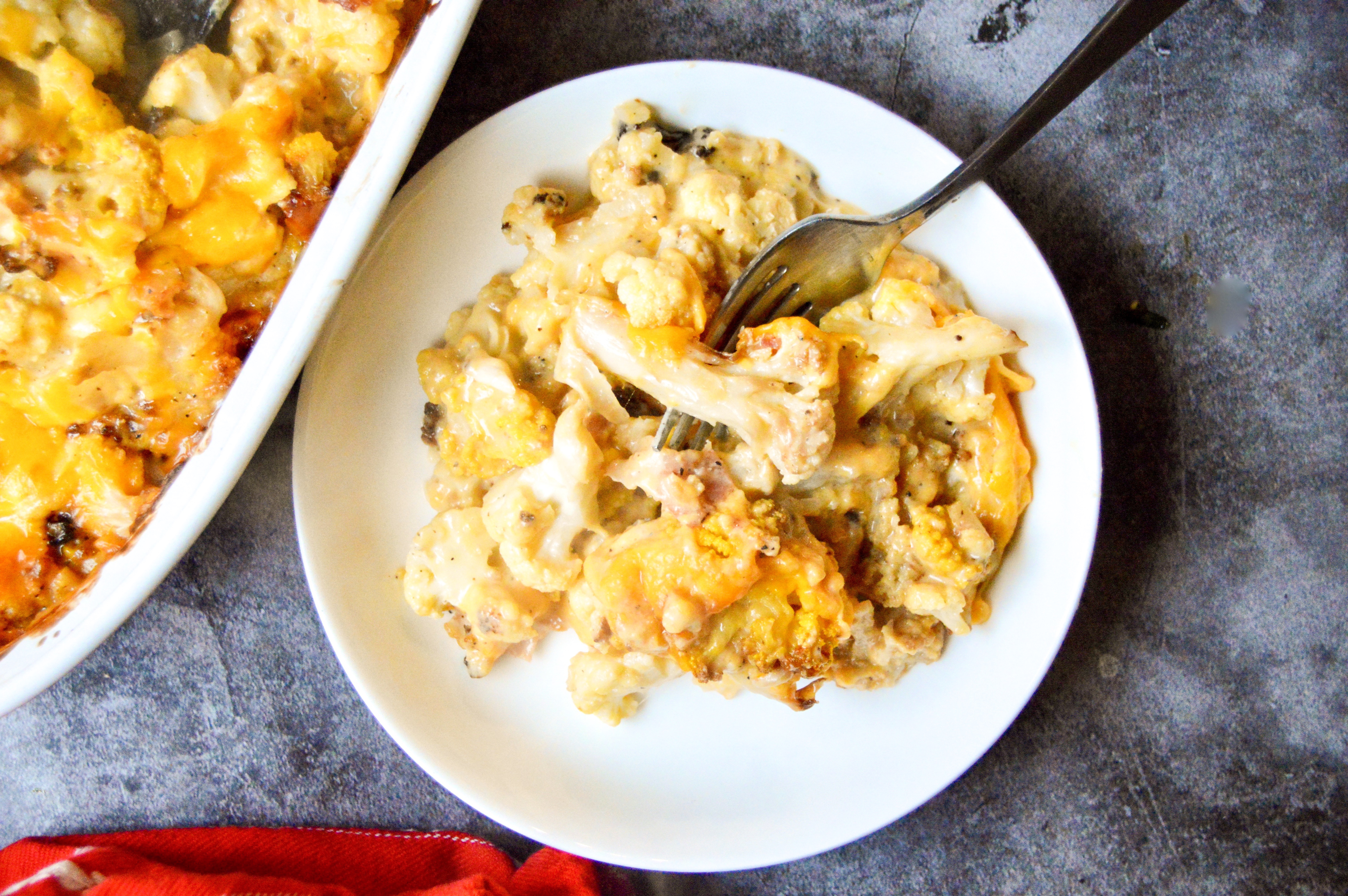 The ultimate Low Carb Comfort Food!! Cauliflower Mac and Cheese is so cheesy and is the most comforting perfect dish minus the pasta! This dish is low carb comfort food that is packed with vegetables and protein.