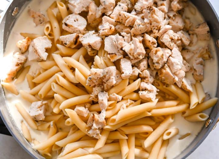 Add the cooked fettuccine directly to the sauce. Toss gently until every strand of pasta is coated in the creamy alfredo sauce.