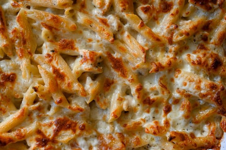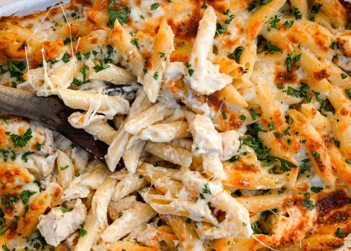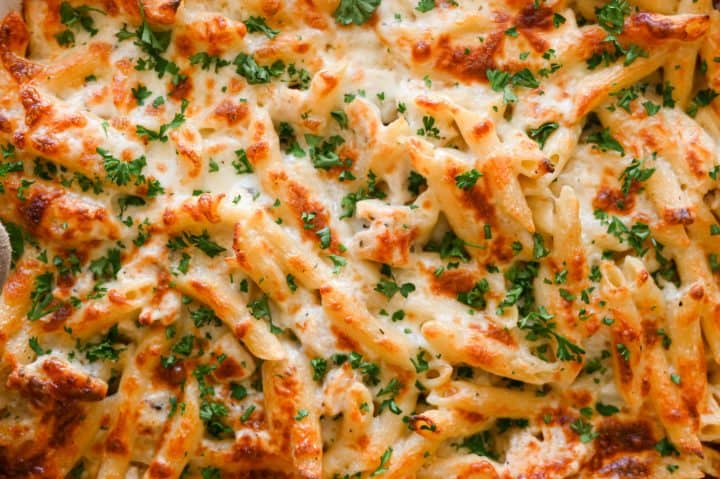 The sauce is smooth and creamy without being heavy. The pasta bakes beautifully and holds onto every bit of that rich alfredo sauce. And the layer of melted cheese on top creates the kind of finish everyone gets excited about.