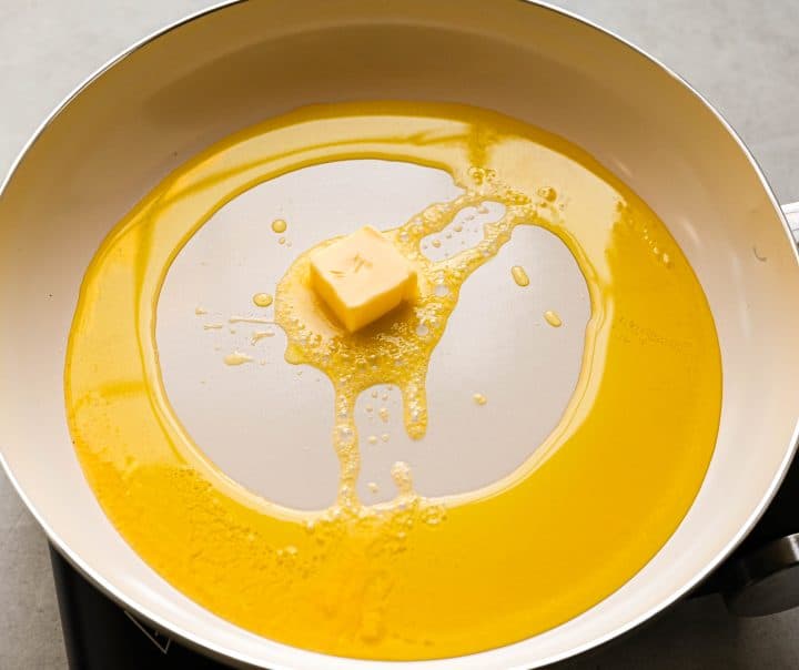 Heat 1/3 cup oil + 2 tbsp butter in a large skillet over medium heat. The oil helps with crispiness, while the butter brings all the flavor.