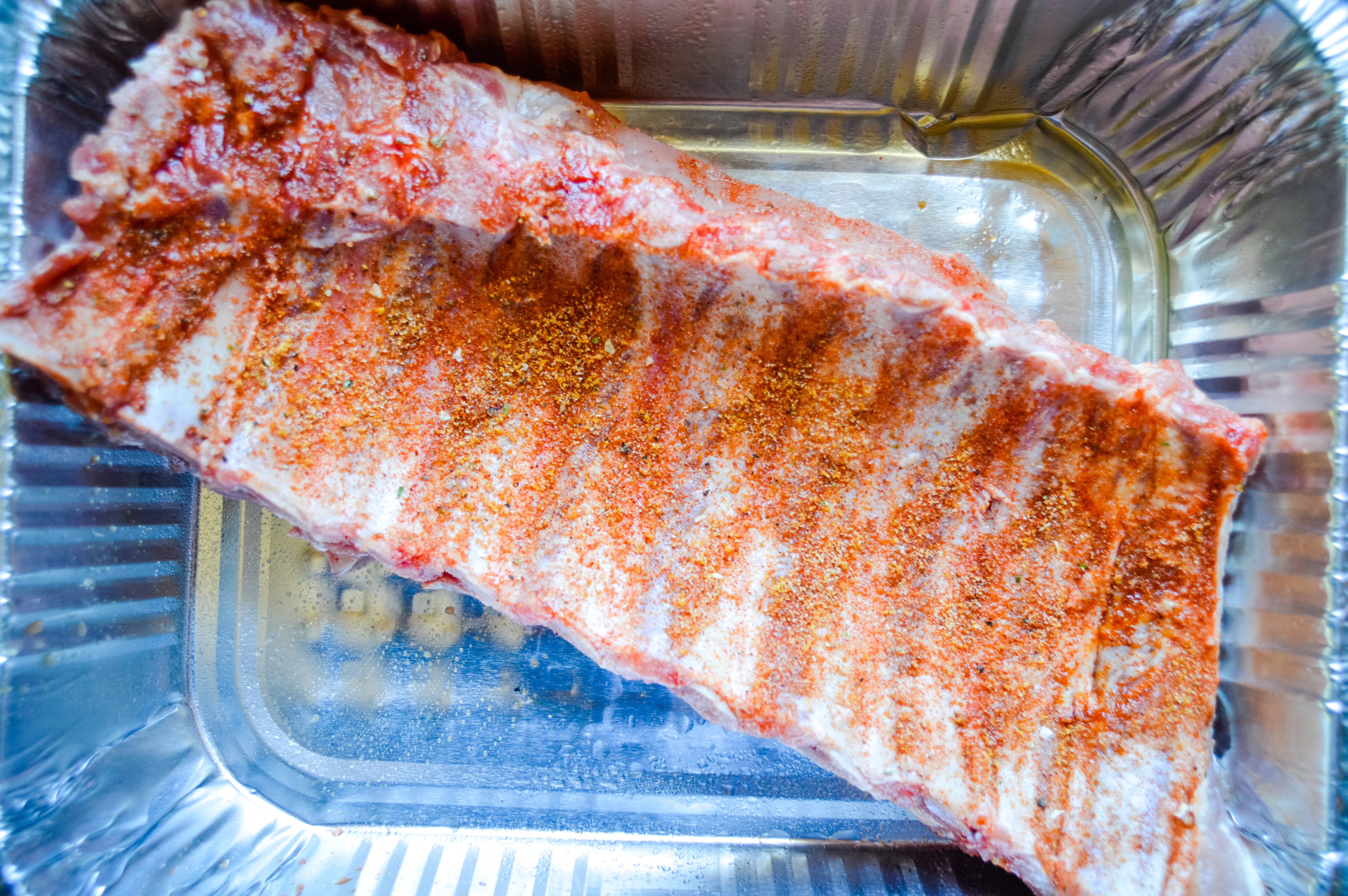 - Sprinkle some of the rub on the back of the pork ribs. Rub and press it in to really get the meat to absorb the flavor. The rack I was working with was rather big so I cut in half to fit inside the aluminum tray. Flip the ribs over and season the other side. Put as much of the seasonings as will stick to the ribs, don't worry about the stuff that falls off. Cover the tray with aluminum foil.