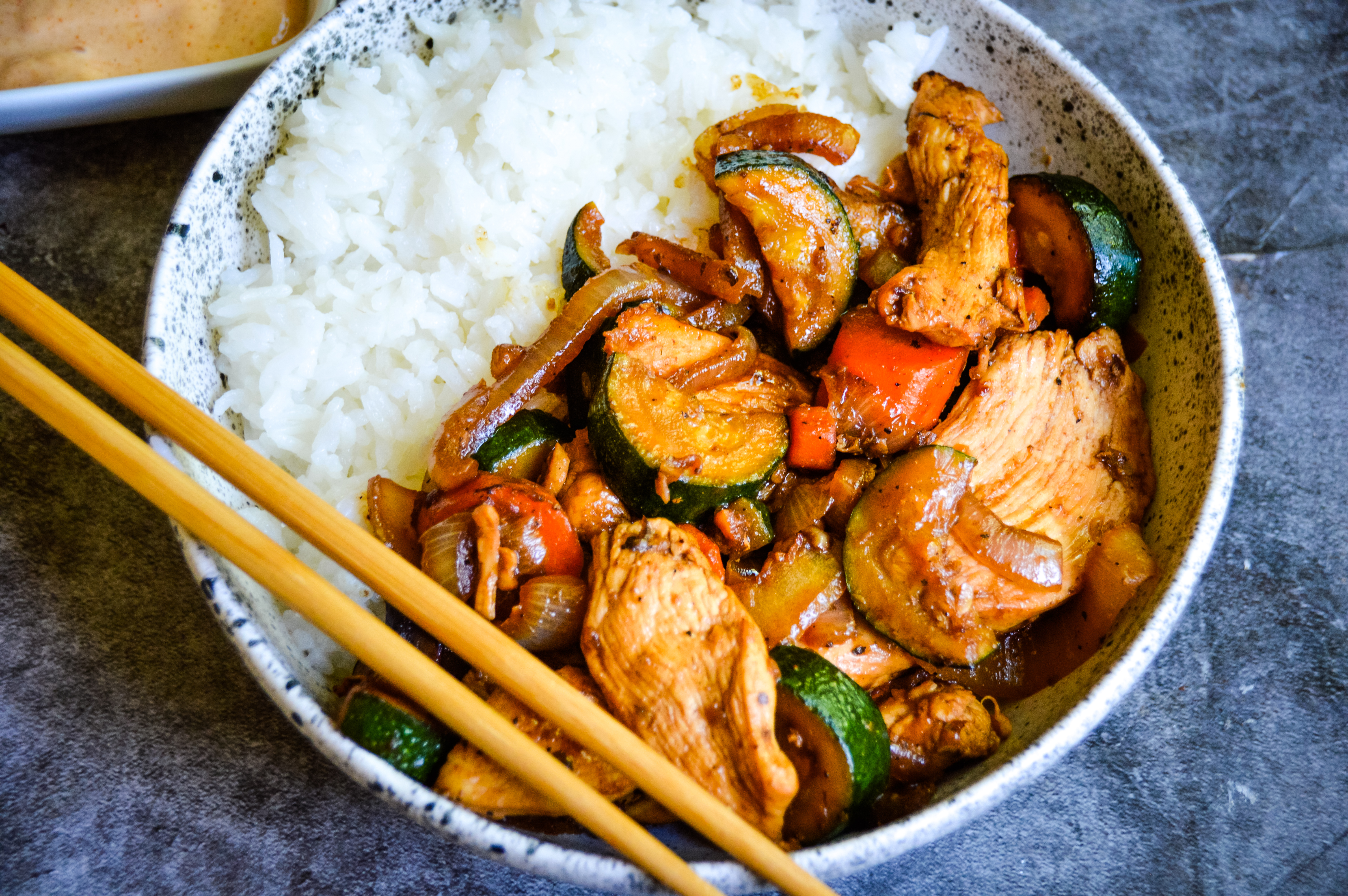 This Hibachi Style Chicken and Veggies a quick and easy weeknight meal. This healthy chicken stir fry served over rice with some Yum Yum style sauce. Yum Yum style sauce is better after it sits overnight in the fridge. It can be made ahead of time and stored in the fridge, in a sealed container. Hibachi Style Chicken & Veggies + Sauce