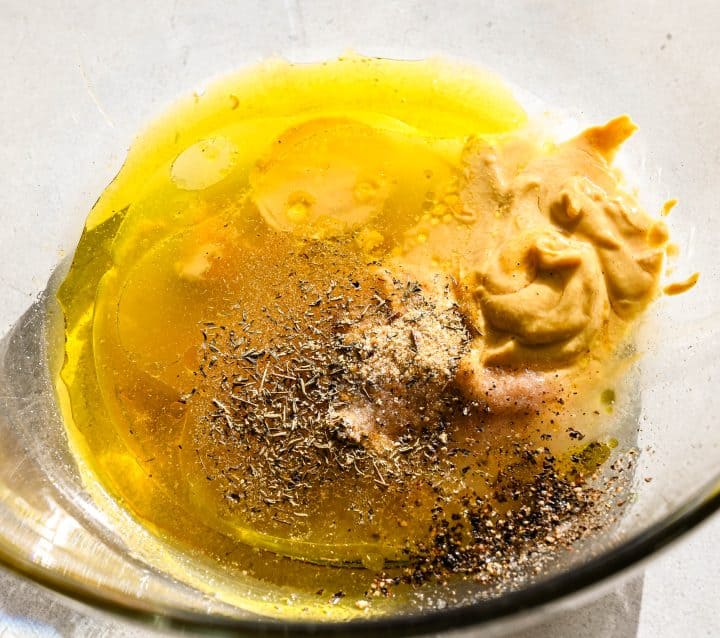 - In a mixing bowl, whisk together honey, Dijon mustard, olive oil, lemon juice, garlic powder, onion powder, thyme, salt, and black pepper until smooth.