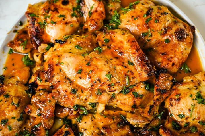 Using chicken thighs is key here. They stay juicy, bake beautifully at a high temperature, and soak up the honey mustard sauce so well. The lemon juice brightens everything and keeps the dish from feeling too heavy, while the garlic powder, onion powder, and thyme add that cozy, savory flavor that makes the kitchen smell amazing while it bakes. Finishing the dish with fresh parsley adds color and freshness that makes it feel just a little extra special, even though it’s incredibly easy.