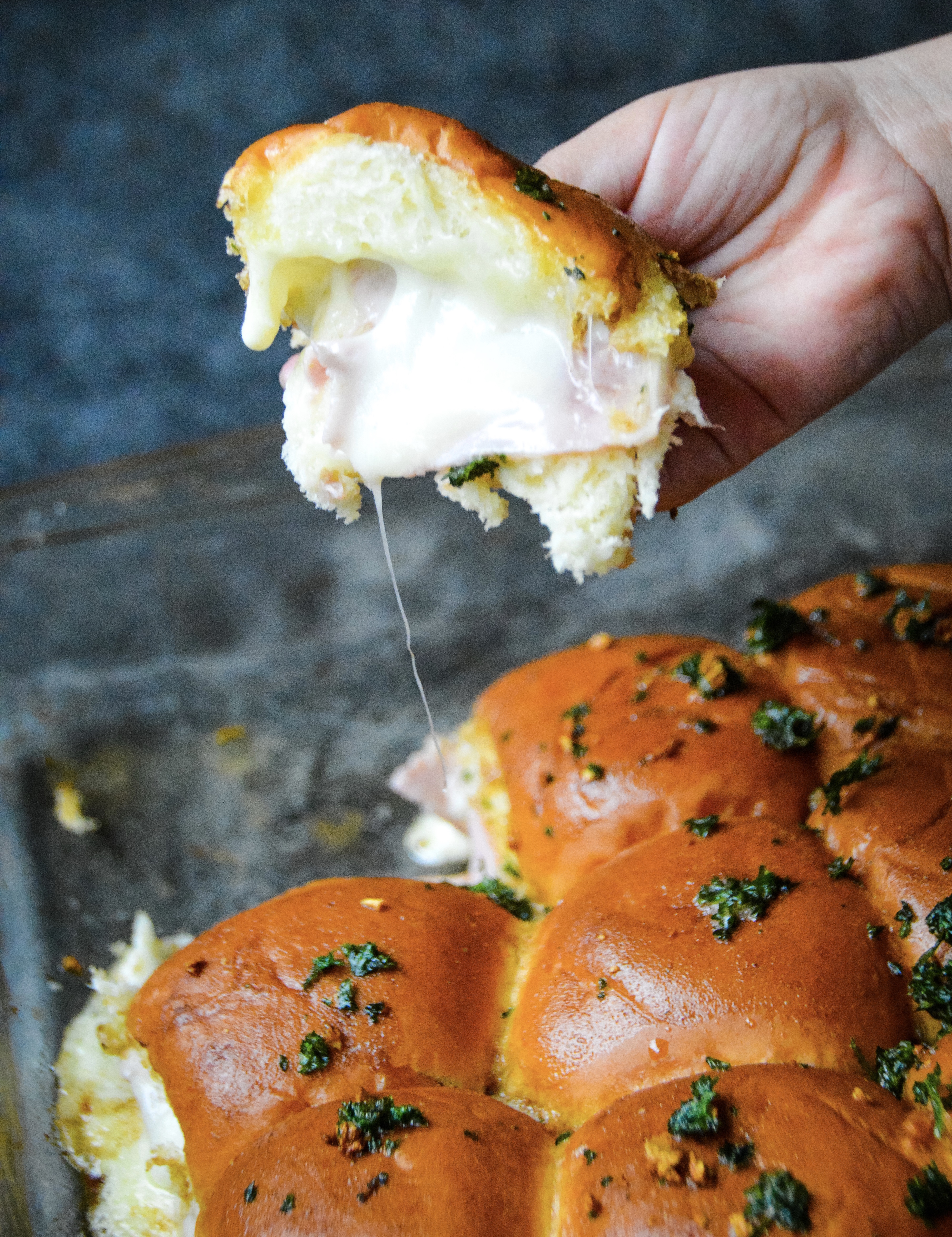 On the rainiest of days, these Hot Ham and Cheese Sandwiches were perfect. Between our COVID quarantine and the rain, we could all use a little comfort food. Nothing better than a soft warm Hawaiin roll stuffed with melted jack cheese, black forest ham, then covered with garlic butter!!