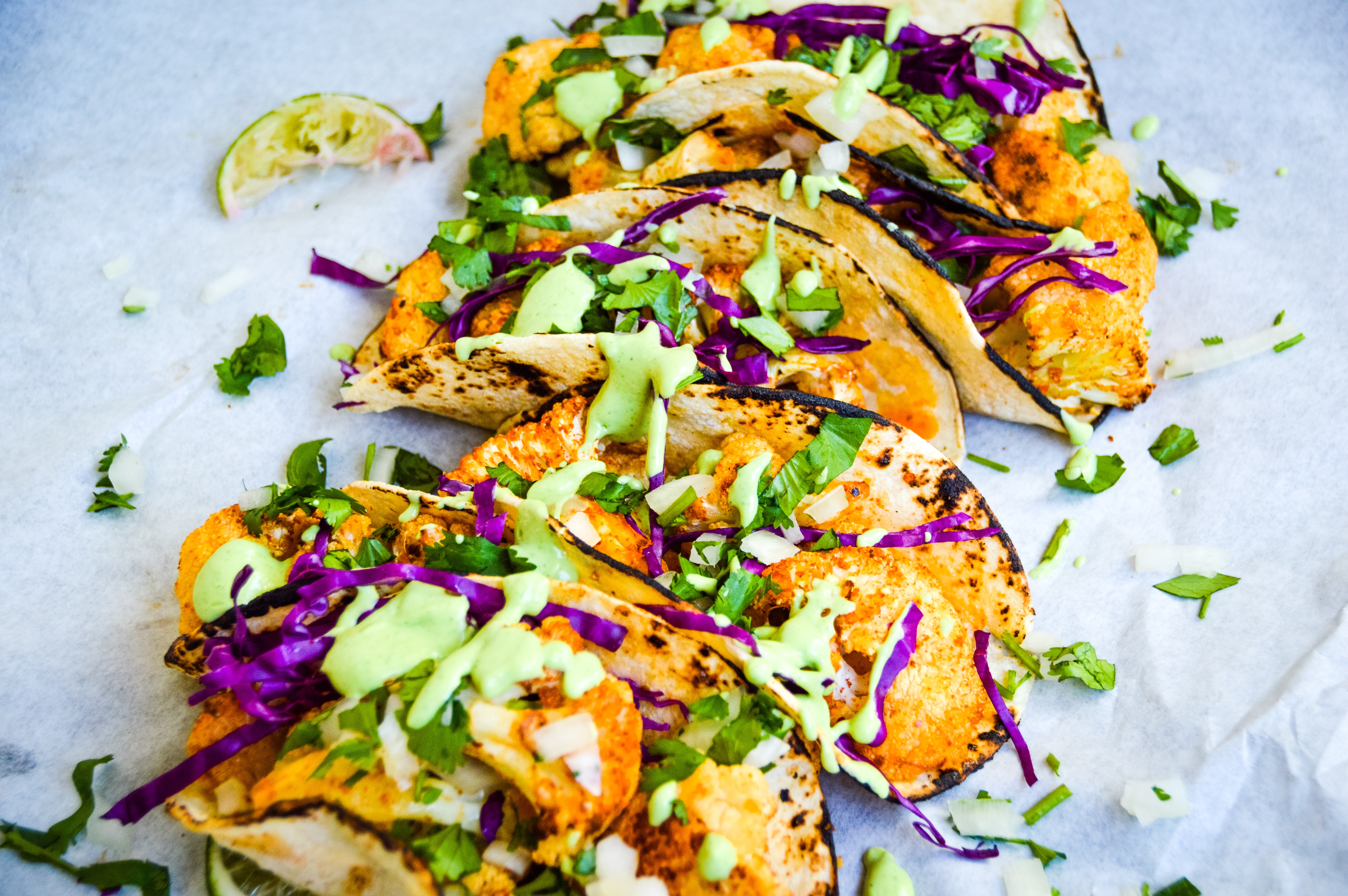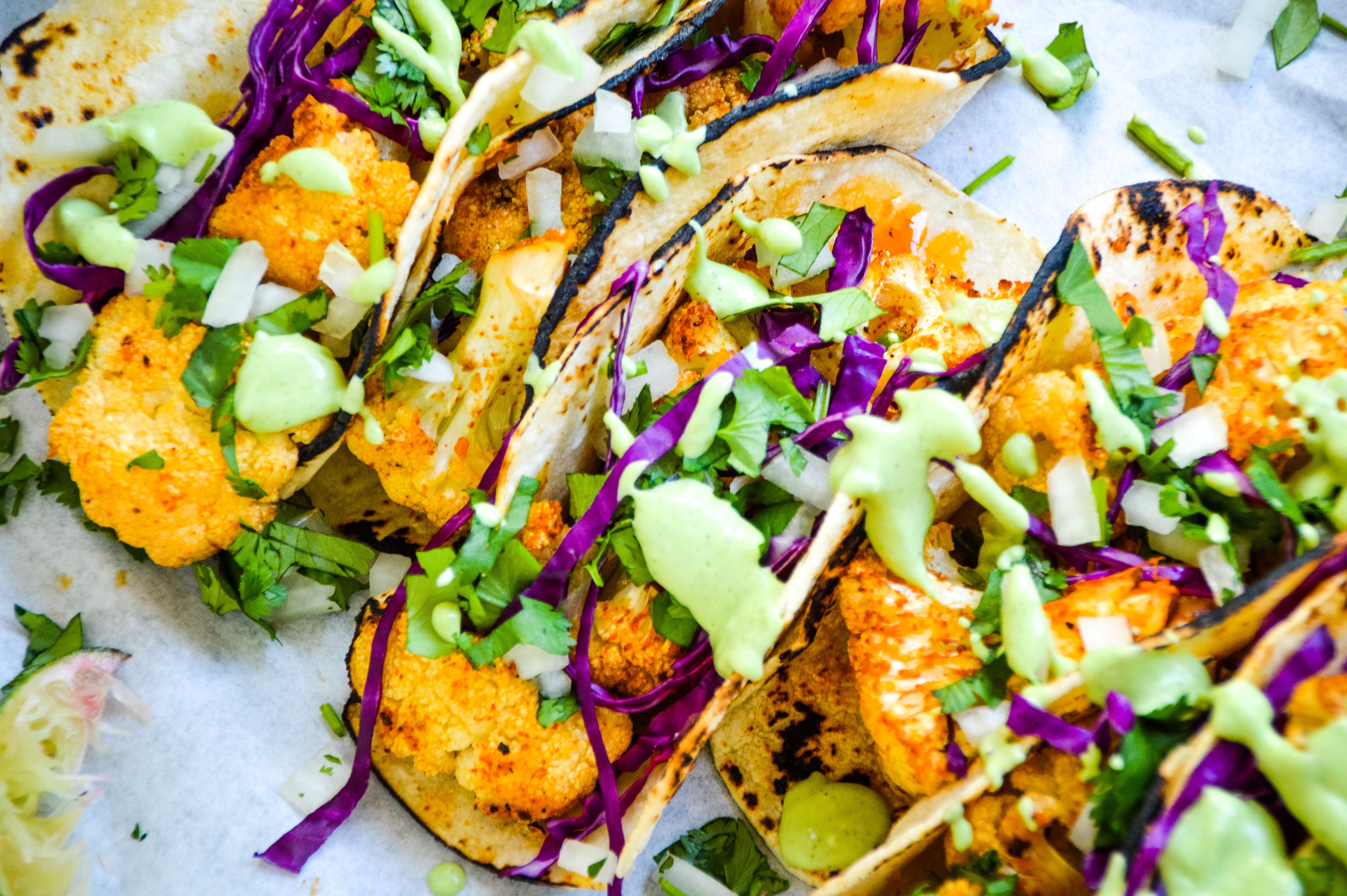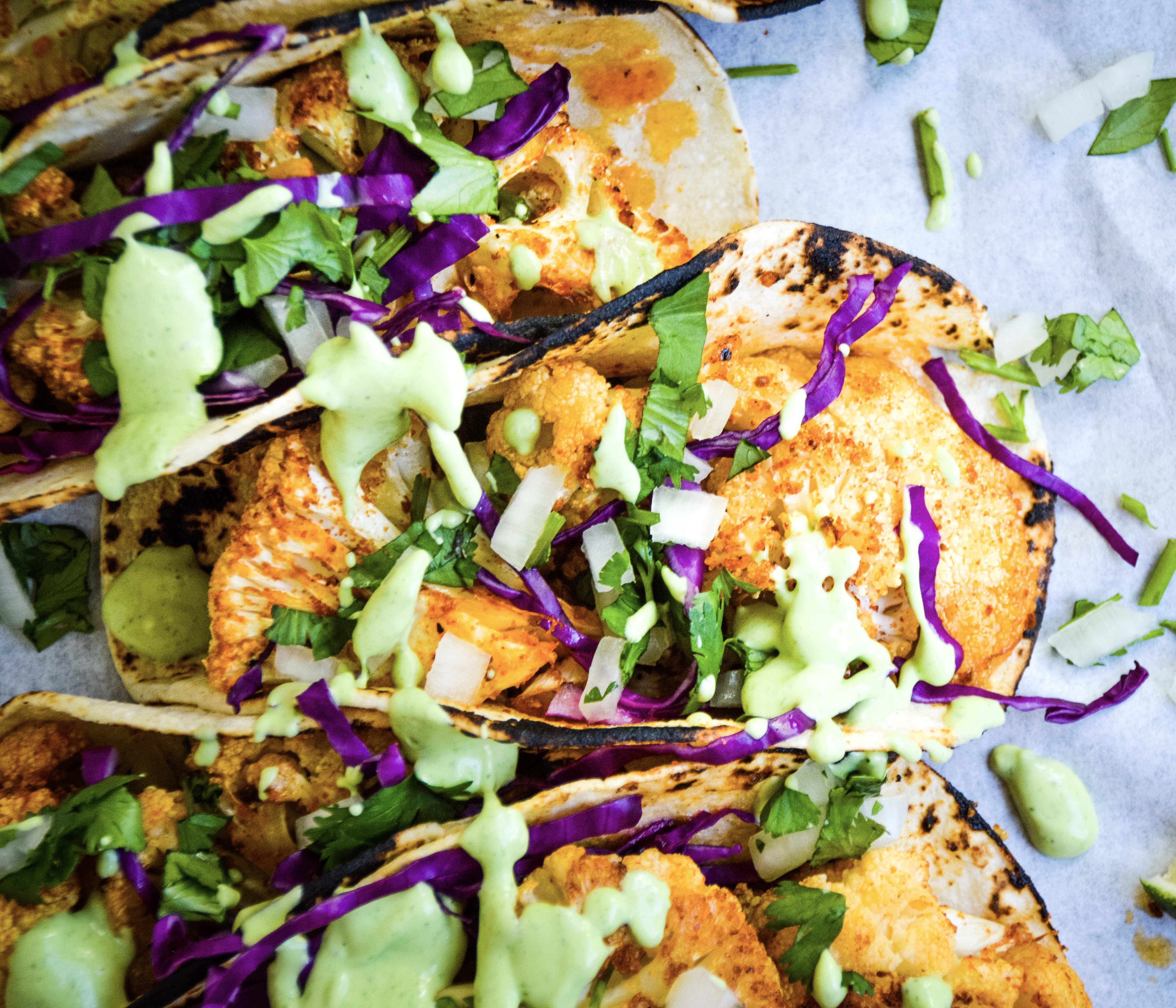 - Add the roasted cauliflower to the tortillas and top with your favorite toppings. Drizzle with the crema, serve immediately. Enjoy!