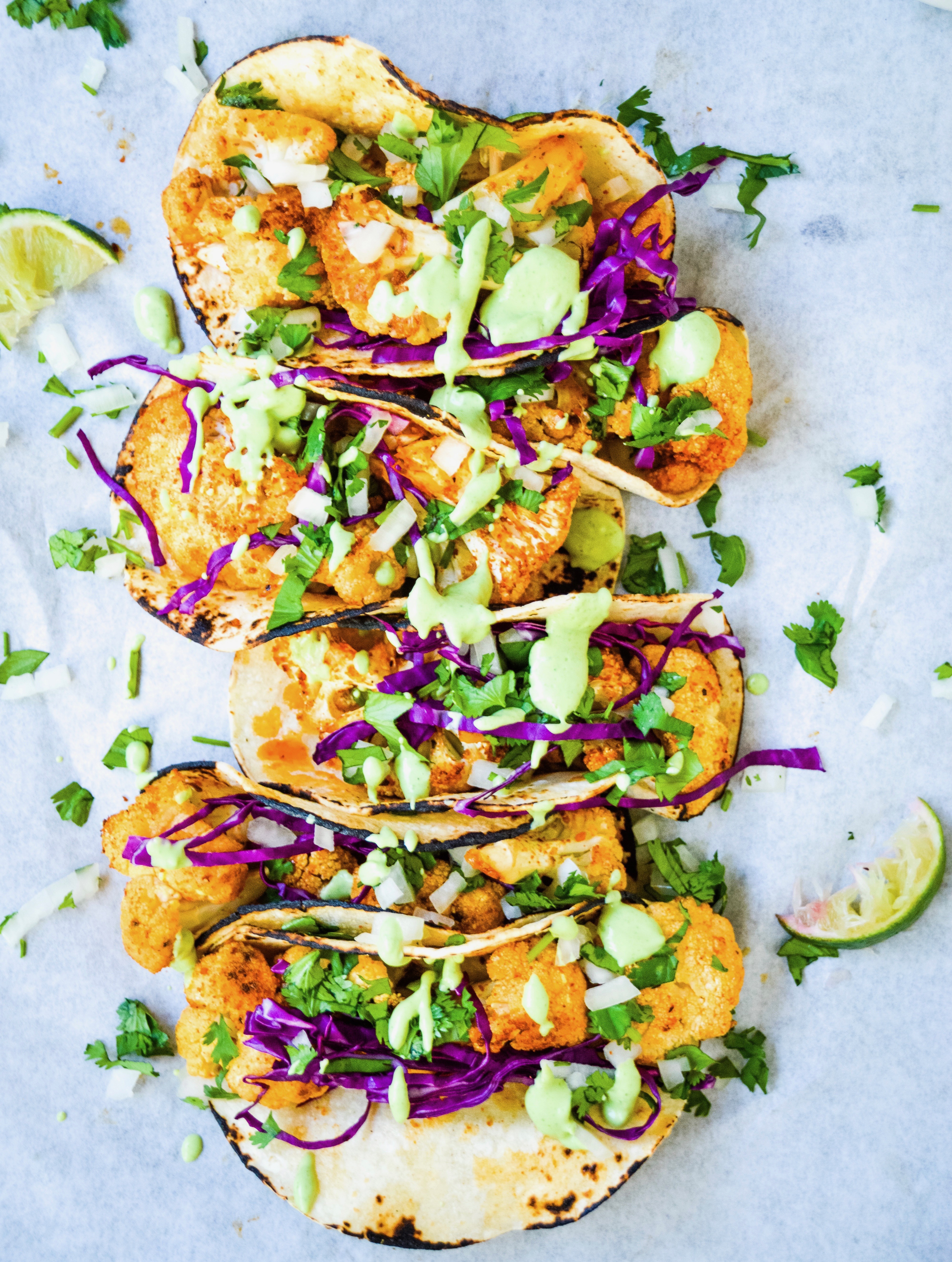 - Add the roasted cauliflower to the tortillas and top with your favorite toppings. Drizzle with the crema, serve immediately. Enjoy!
