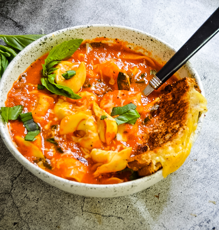 This Roasted Red Pepper & Tomato Soup with Tortellini reminds me so much of childhood!! My mom would make this with warm gooey grilled cheese for us to dunk. I’m getting hungry just talking about it!
