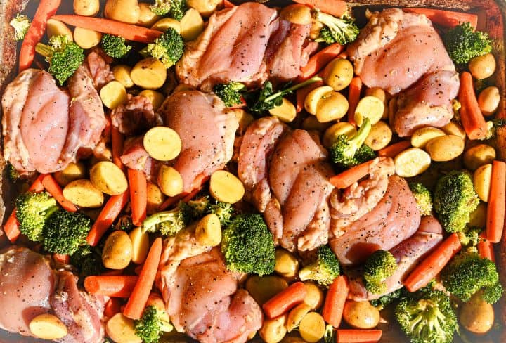 Add the chicken, broccoli, carrots, and potatoes to a large sheet pan.
