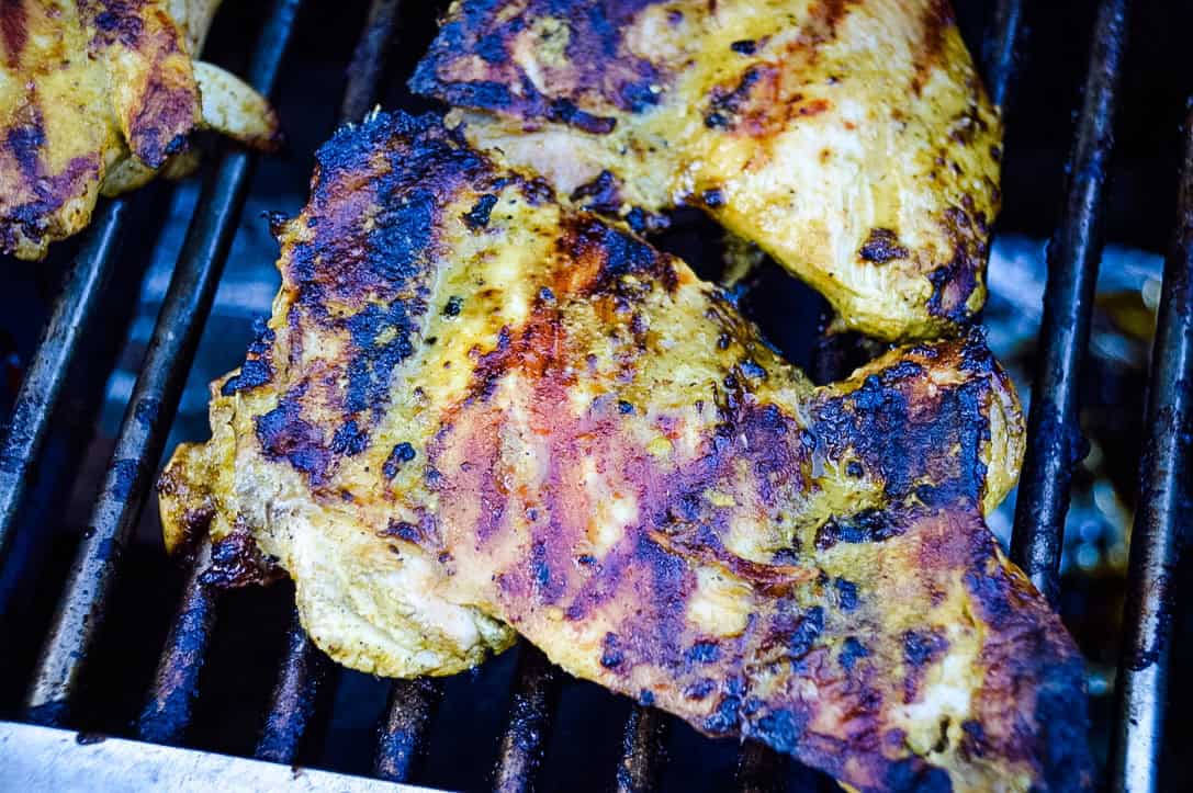 I used a gas grill to cook my chicken, but a cast iron would work great too! It’s been so hot here, almost 100 out daily, so cooking outside saves the house from heating up! I prefer using chicken thighs for this recipe as they stay so juicy and flavorful, even in leftovers! Personally, I like to make about 3 lbs of chicken thighs and use it for various meals throughout the week, it cuts down cooking time, and makes dinner effortlessly easy this way!