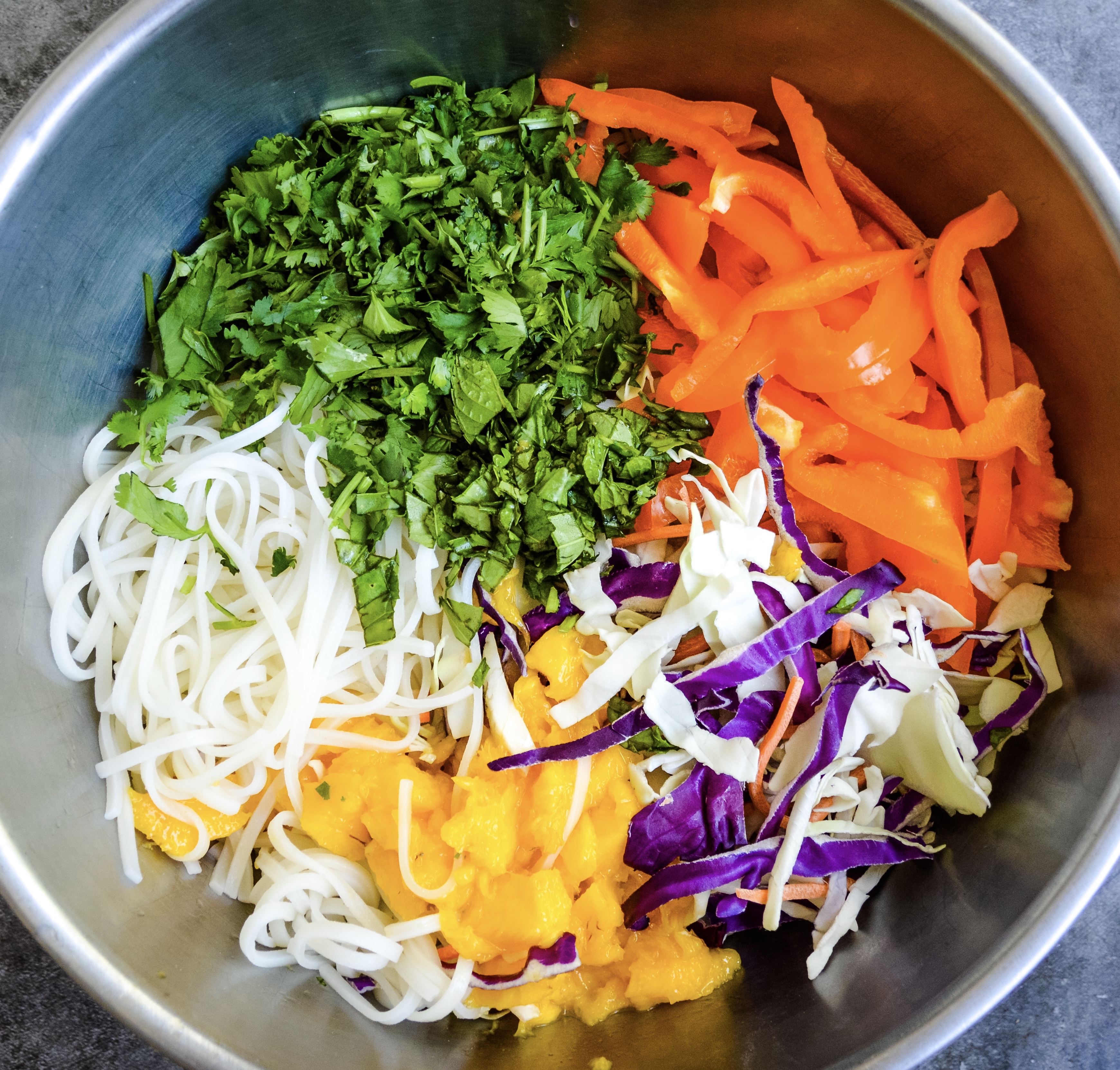 - In a large bowl toss the noodles, veggies, herbs, and mango. Pour in the peanut sauce and toss till combined.
