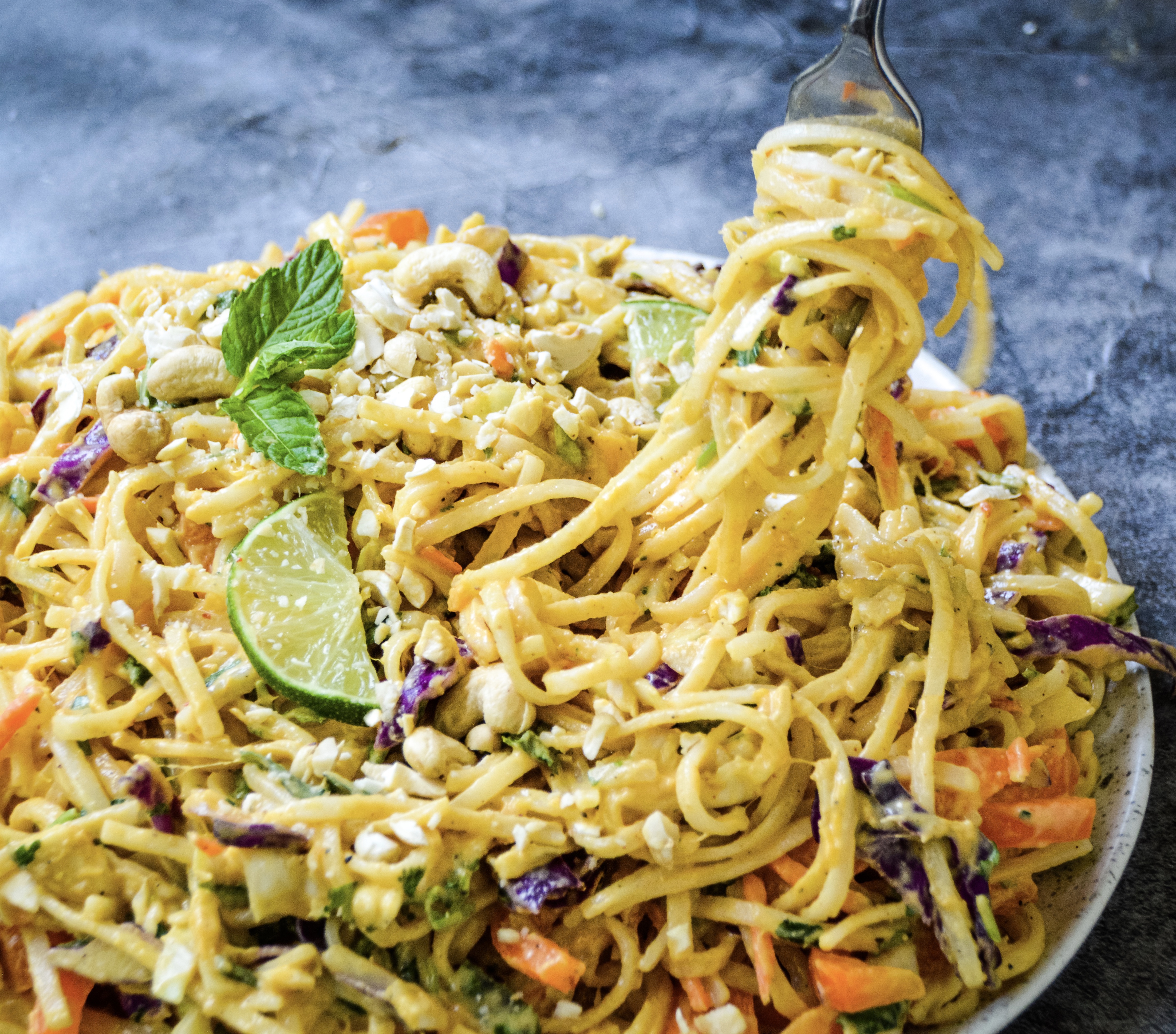 It starts with 12 ounces of stir fry rice noodles prepared according to package. Linguini or soba noodles would work great too. While the noodles are cooking prepare your peanut sauce by blending all the ingredients together. Toss the pasta with your prepared veggies, herbs, and fruit. Toss the salad in the peanut sauce and top with toasted crushed cashews or peanuts. Let the salad sit in the fridge for 20 minutes before serving. The Thai Noodle Salad gets more flavorful the longer it sits.