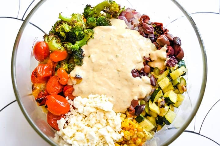 - In a large bowl, combine the pasta with the roasted veggies and feta. Pour the hummus dressing over the pasta salad, tossing to coat.