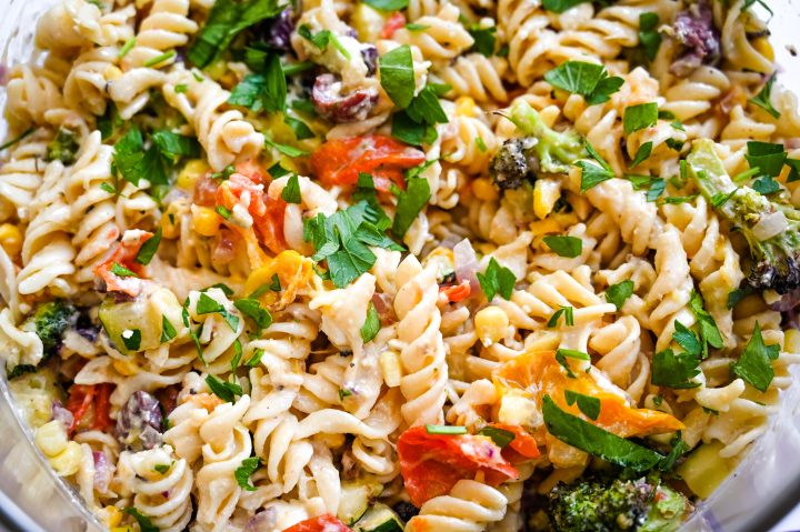 - In a large bowl, combine the pasta with the roasted veggies and feta. Pour the hummus dressing over the pasta salad, tossing to coat. Garnish with fresh parsley before serving. Enjoy!