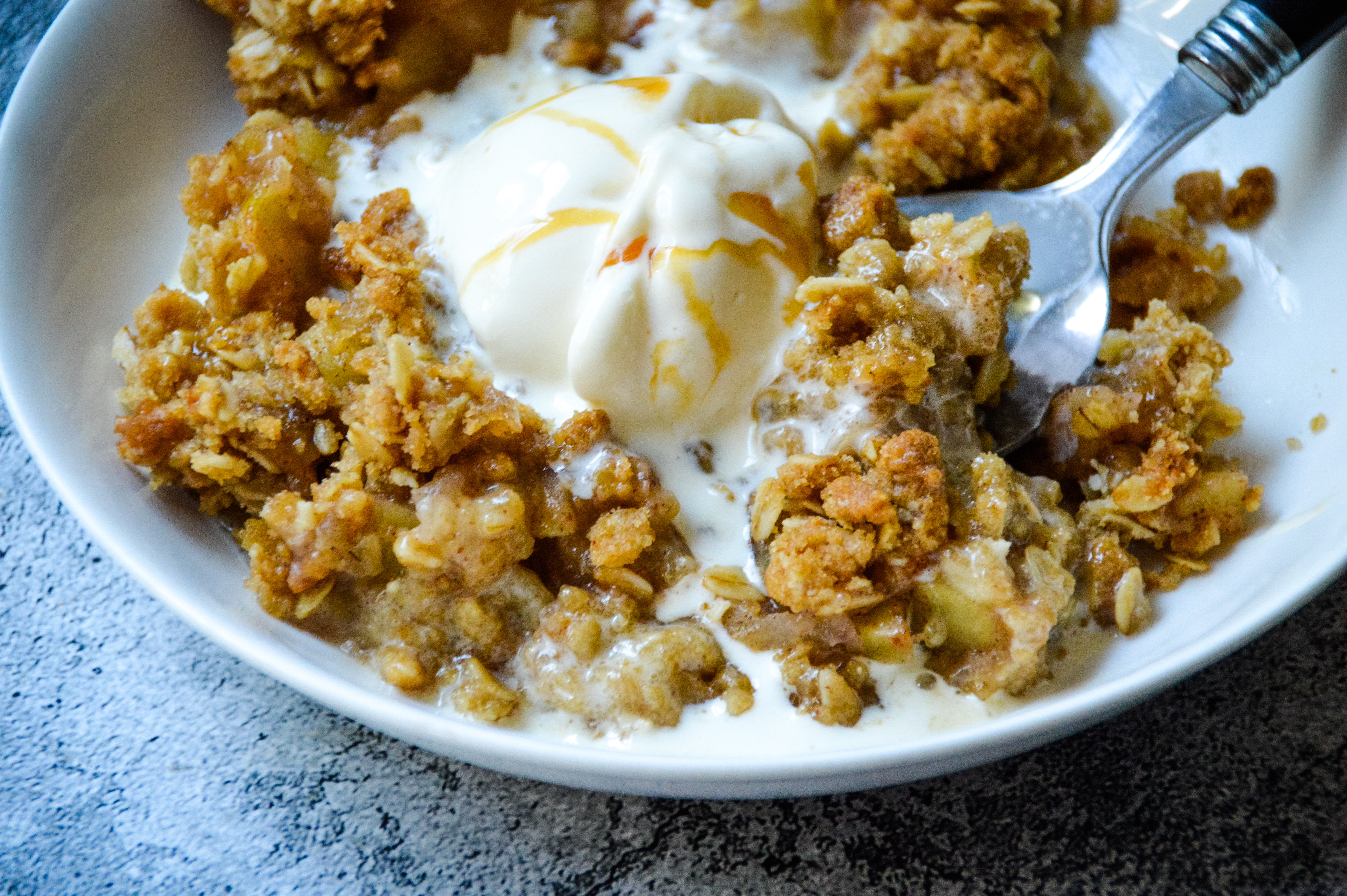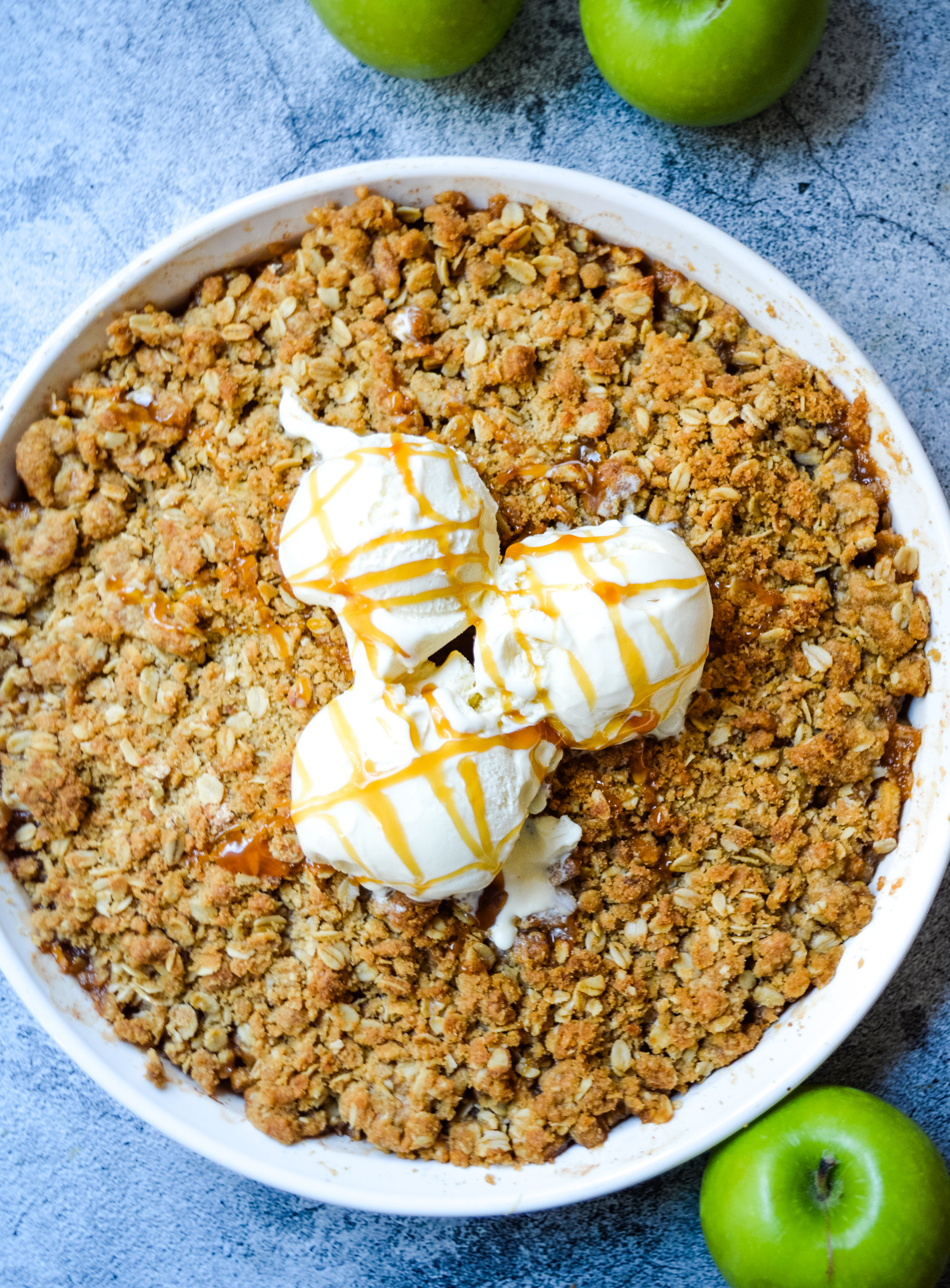 - Pour crumbles over apples in the baking dish, and gently pat it down and even it out. Bake for 40-50 minutes, until golden brown and bubbly. Serve with vanilla ice cream and caramel sauce, enjoy!