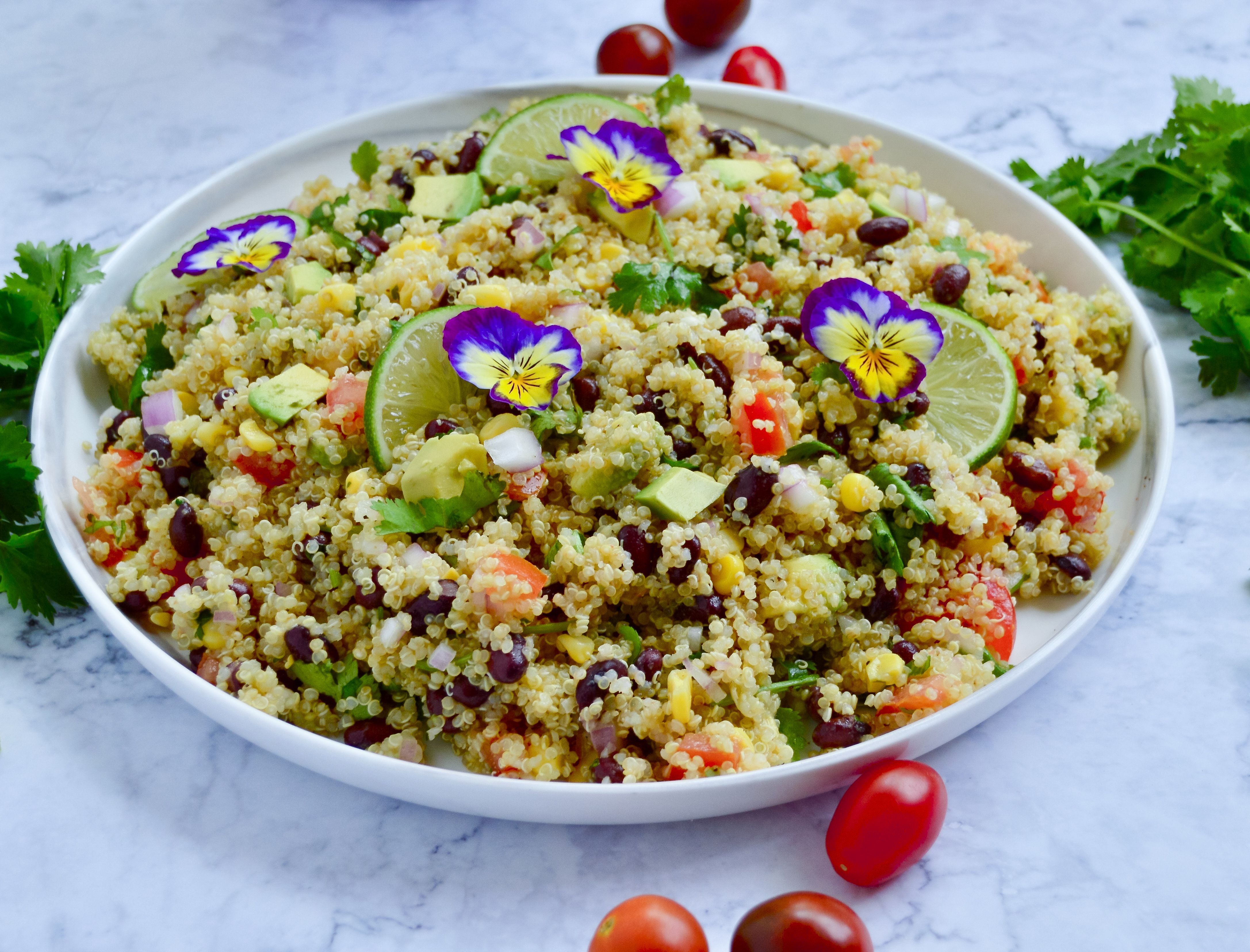 The most delicious and fresh Mexican Quinoa Salad of all time. Full of things you most likely already have on hand! This is a complete meal, but also goes great with your favorite protein choice. The salad is vegan friendly, gluten and refined sugar free.