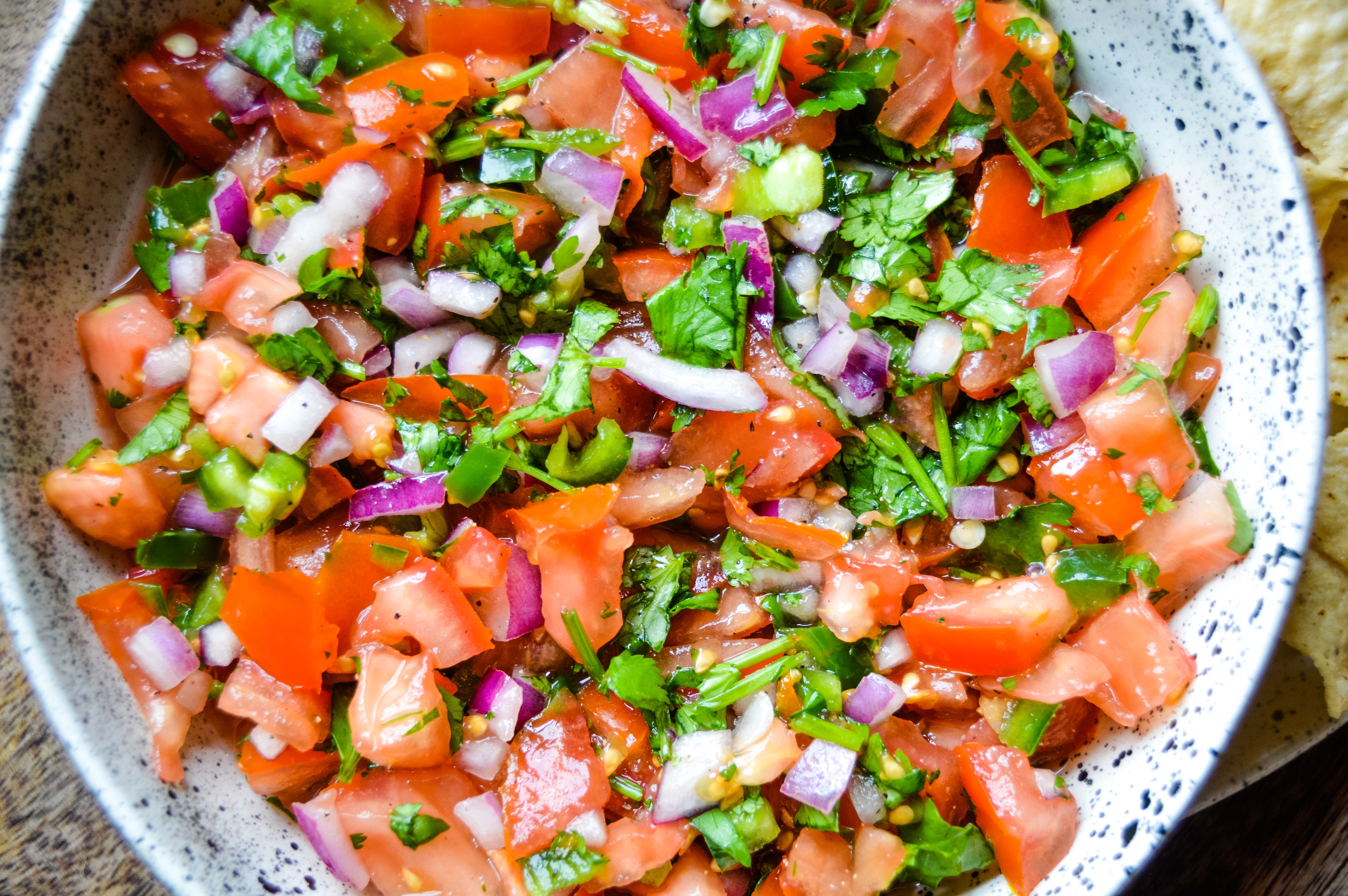 Growing up with a Mexican mother, I was absolutely spoiled with some of the best authentic Mexican food! Pico de Gallo is an easy salsa and tastes great on just about anything; it is also great as a lower-calorie salad dressing replacement! I am eating it with tortilla chips as I type and get crumbs all over myself, ha!