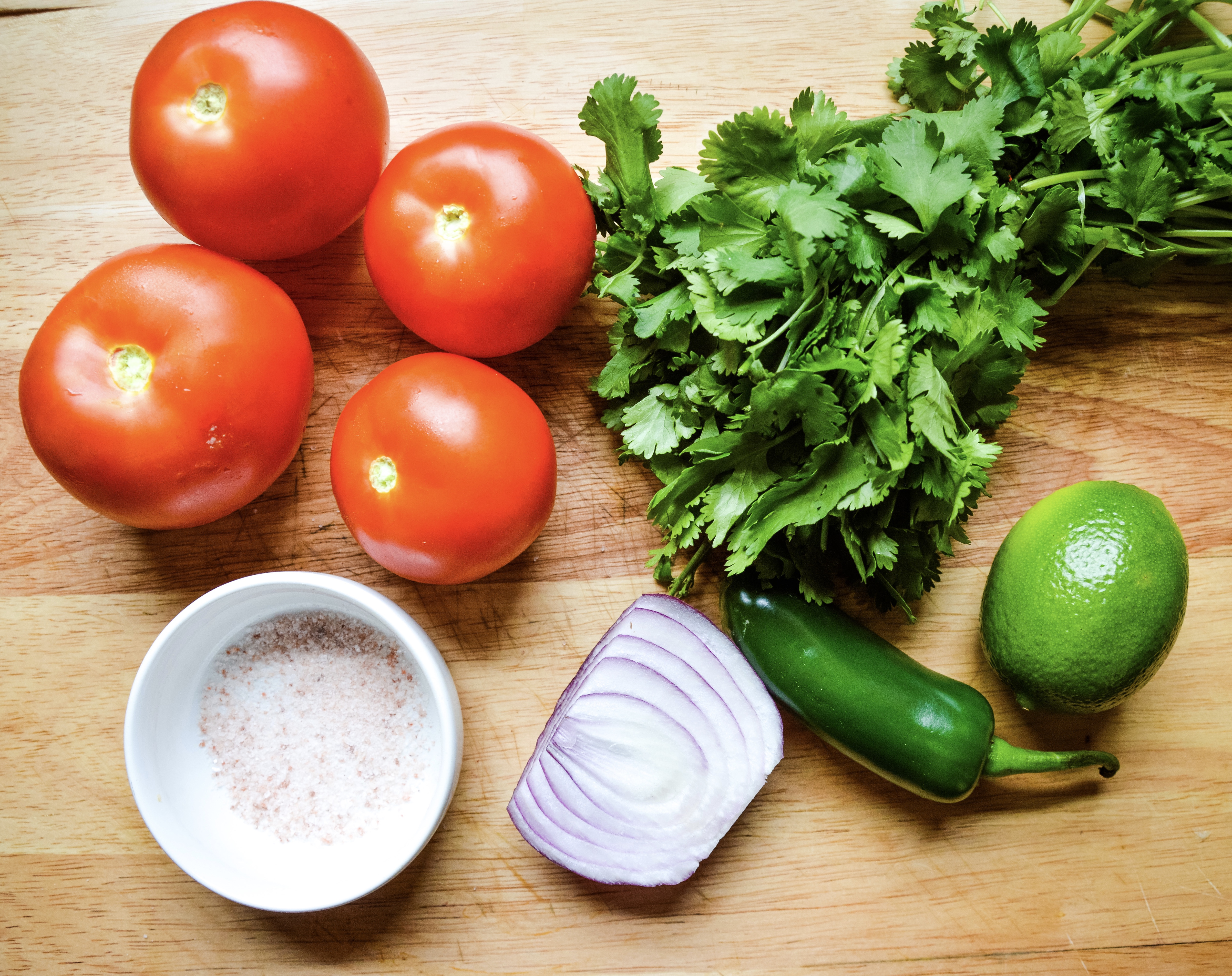- Toss your tomatoes, onion, and cilantro together. Squeeze in your lime just and season with salt and pepper to taste. Store in the fridge. Serve with tortilla chips or your favorite Mexican dishes, enjoy!