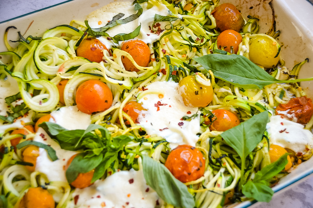 Roasted Tomato and Zucchini Noodles with Burrata