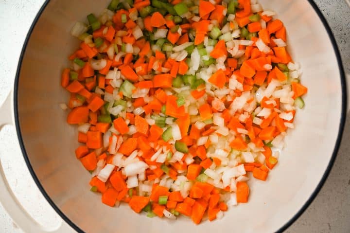 - Heat olive oil and butter in a large pot over medium heat. Add onions, carrots, and celery. Cook until softened, about 5–7 minutes. Add garlic and cook 1 minute more.