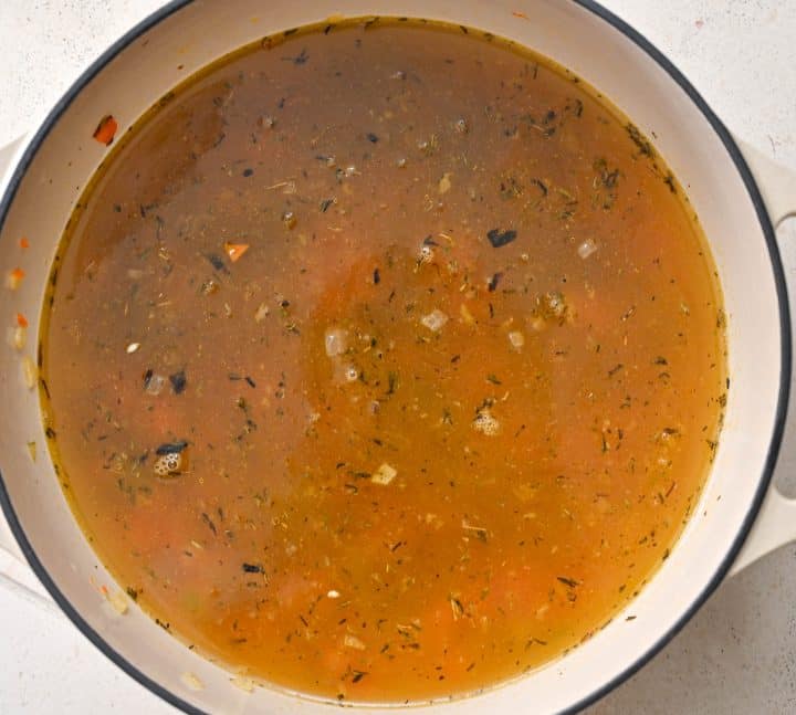 A heavy-bottomed 6–8 quart Dutch oven or soup pot is perfect for this recipe. It heats evenly and gives the best simmer for wild rice.