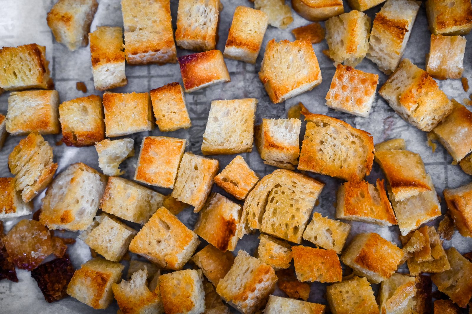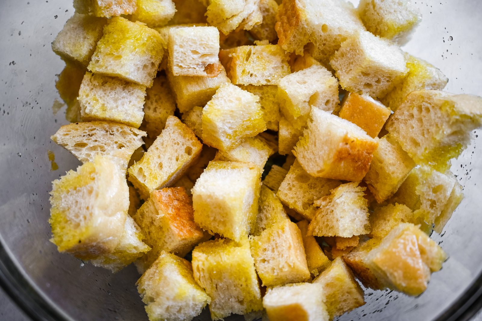 Cut the bread into bite-sized pieces and transfer them to a baking sheet. Drizzle with olive oil and salt, and toast them lightly in the oven to achieve a crisp texture.