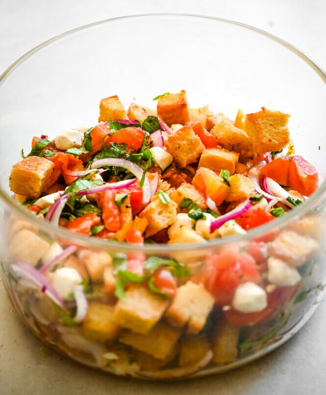 Cover the bowl and refrigerate for at least 15 minutes to an hour, allowing the bread to soak up the flavors of the dressing and the vegetables to marry together beautifully.
